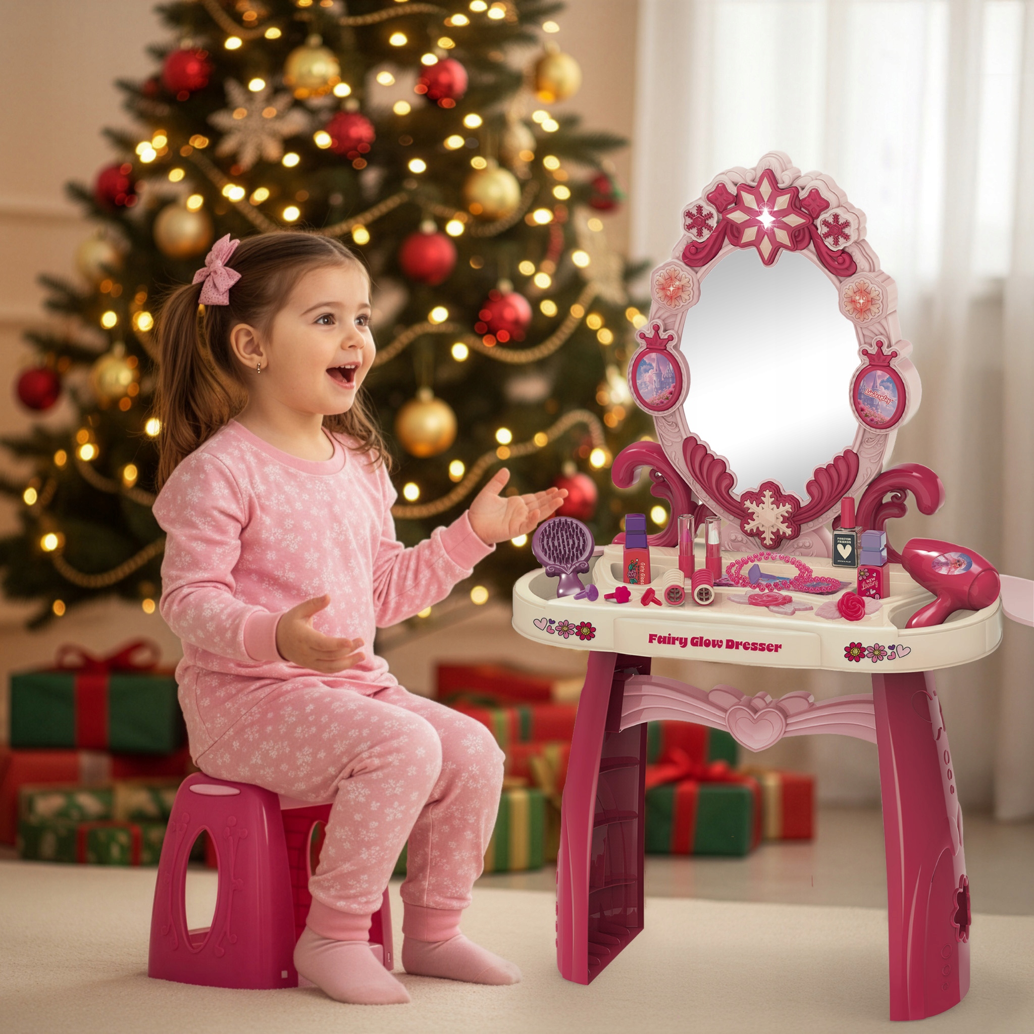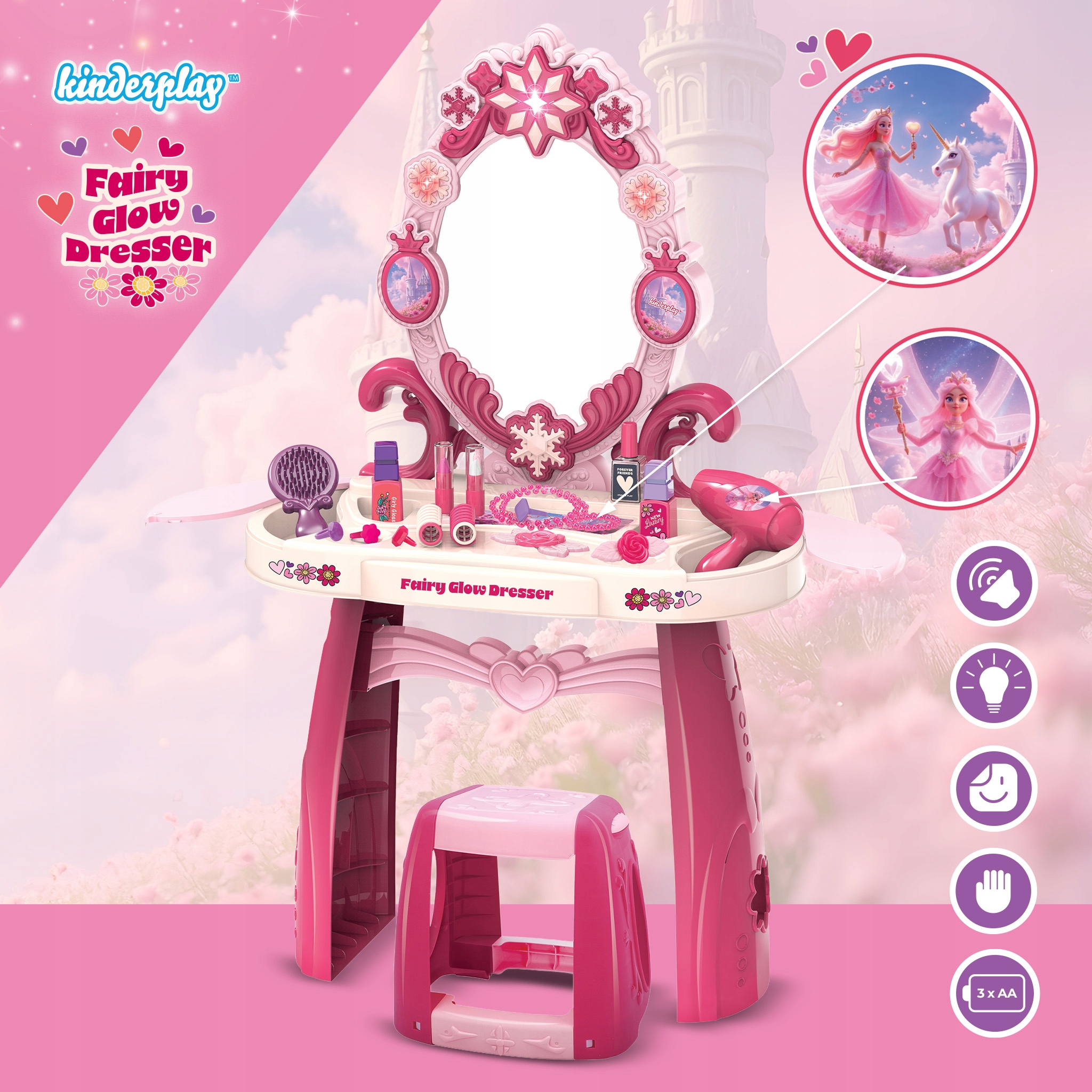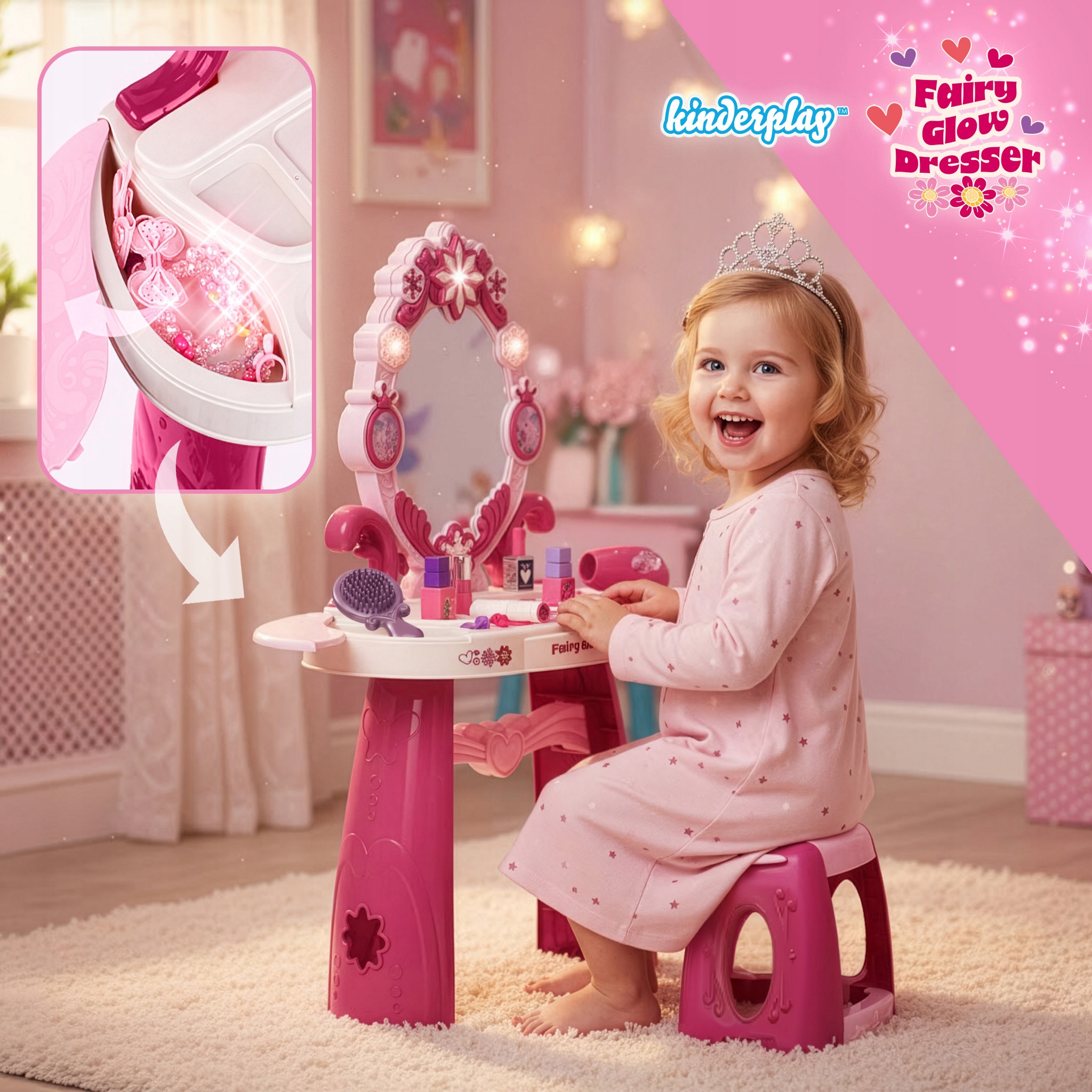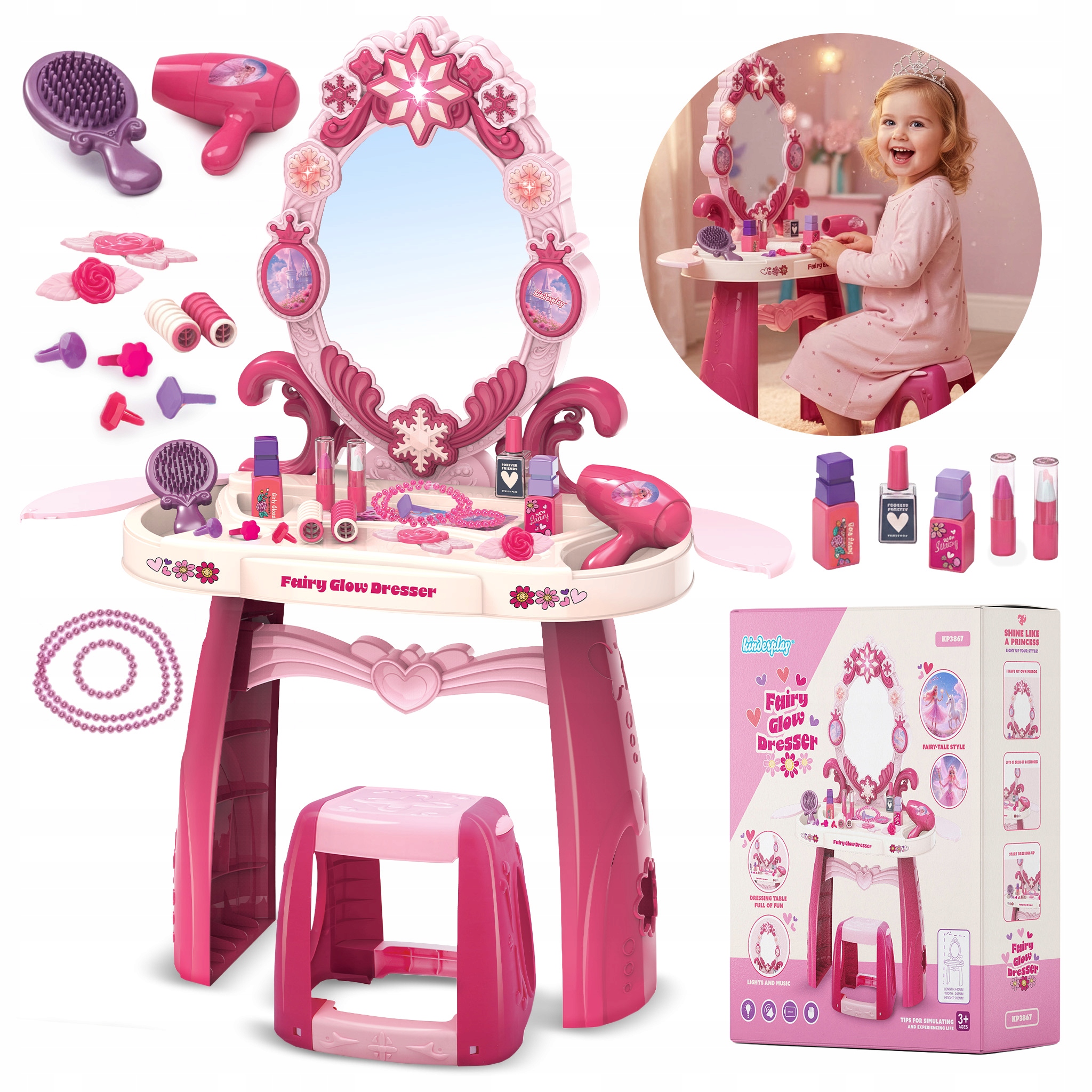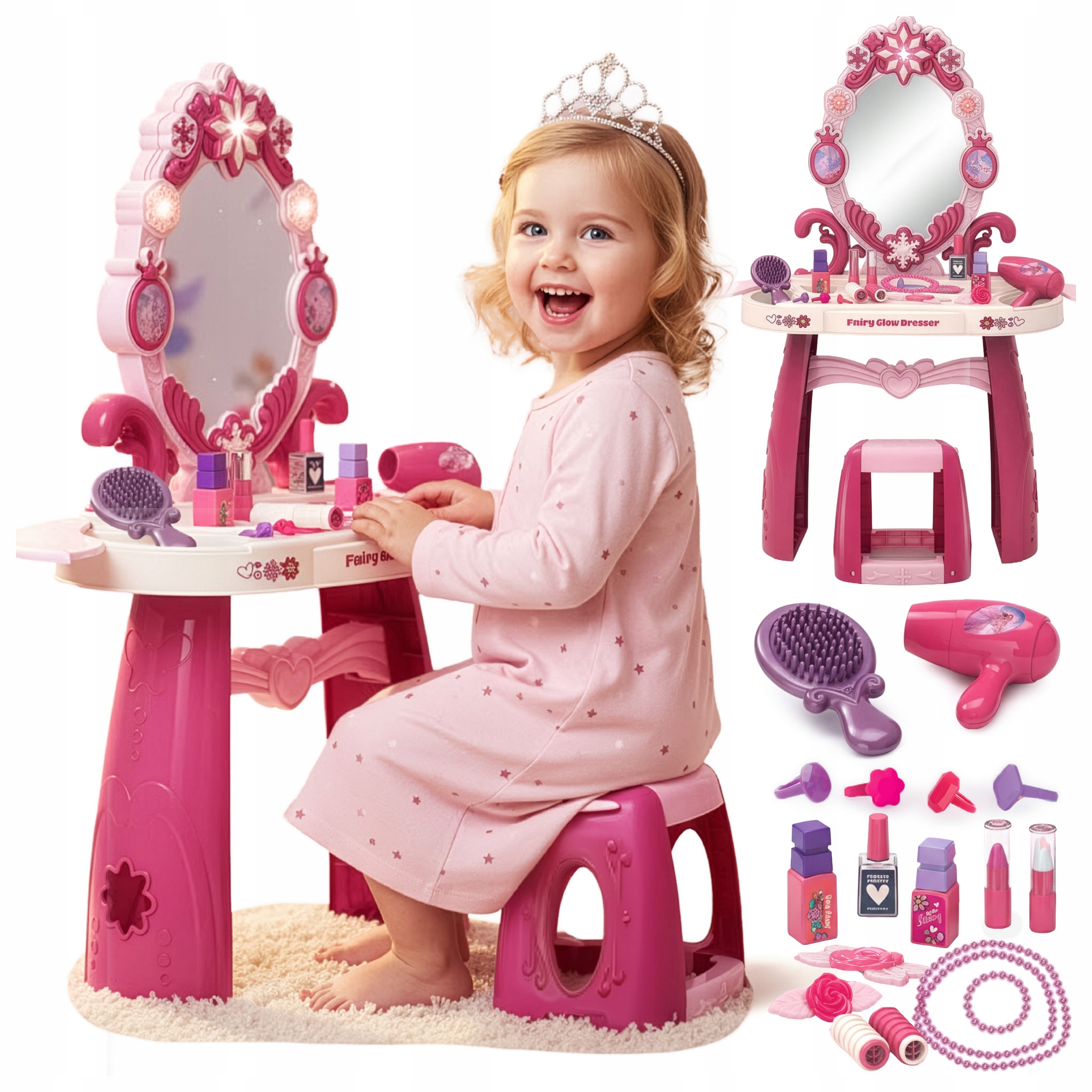 Откройте для себя центр творческих развлечений для маленькой элегантной девочки, созданный с учетом безопасности и радости. На туалетном столике установлено большое, безопасное зеркало, не представляющее риска разбиться, позволяющее свободно играть, подражая взрослым. Веселье становится еще более волшебным благодаря интерактивным эффектам — система освещения и приятные звуковые эффекты делают каждую минуту, проведенную за укладкой, более привлекательной.