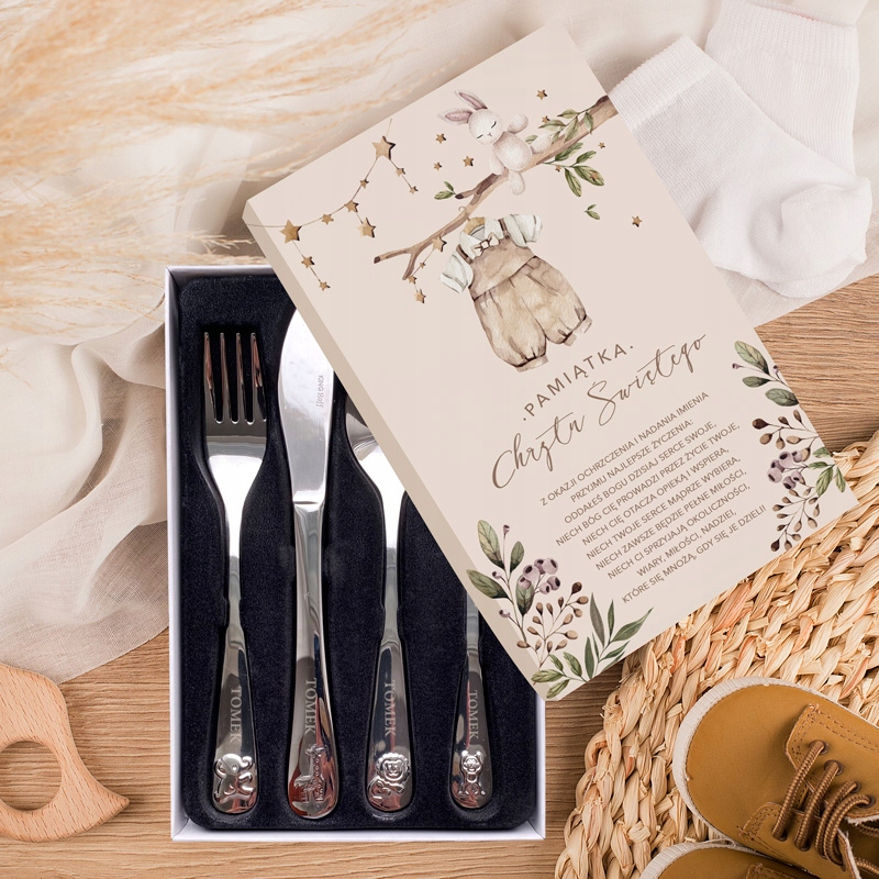 Кроме того, каждый столовый прибор украшен выпуклыми животными на конце ручки. Набор расположен в элегантном футляре, который, в свою очередь, упакован в красивую декоративную коробку. На верхней части упаковки изображен мотив комбинезона для мальчиков, который идеально подойдет в качестве подарка мальчику на крещение. Под изображением одежды написаны пожелания для этого особого случая.