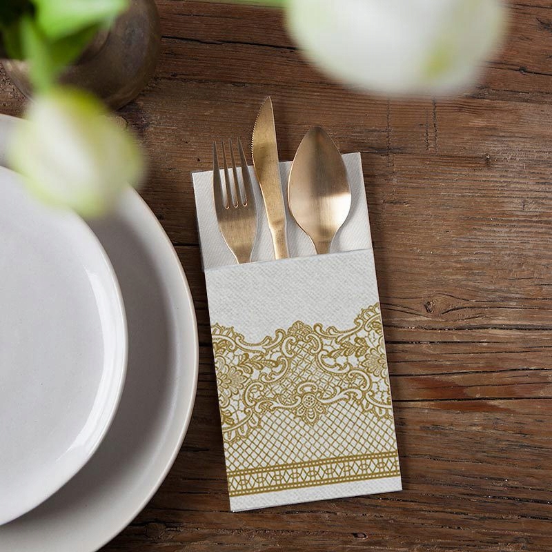 Карманы с золотым кружевом красиво смотрятся на столе с салфетками из этой же серии. p>