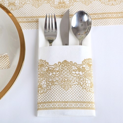 - Столько же в виде 25 столовых приборов из нетканого материала с карманами для столовых приборовбелого цвета, украшенных золотым кружевным мотивом