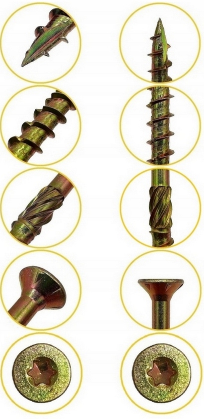 Винты предназначены для соединений деревянных и деревянных элементов (Дворнискую ленту, фанеру, дерево, пластина OSB, пластина MDF). Инновационный дизайн делает работу с ними чистым удовольствием. Строительная мощность была изготовлена из низкоуглеродной стали. Элемент устойчив к таким факторам, как резка и вытягивание. Они не извлекают предшествующее бурение. Разрез в начале нити значительно облегчает заранее. Благодаря этому древесина не сломается. Это решение позволяет создавать крепостные изделия в местах, где невозможно тщательно нажать на элемент. Глубокий и стабильный розетка Torx эффективно передает крутящий момент без эффекта всплывателя. Резак за половину резана расширяется, благодаря тому, что прикрепление требует использования на 20% меньше силы.