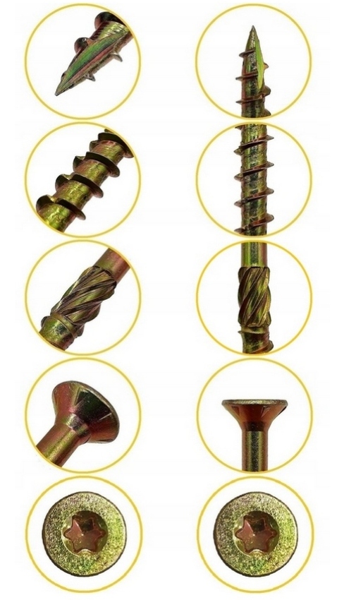 Винты предназначены для соединений деревянных и деревянных элементов (Дворнискую ленту, фанеру, дерево, пластина OSB, пластина MDF). Инновационный дизайн делает работу с ними чистым удовольствием. Элемент устойчив к таким факторам, как резка и вытягивание. Они не извлекают предшествующее бурение. Разрез в начале нити значительно облегчает заранее. Благодаря этому древесина не сломается. Это решение позволяет создавать крепостные изделия в местах, где невозможно тщательно нажать на элемент. Глубокий и стабильный розетка Torx эффективно передает крутящий момент без эффекта всплывателя. Резак в половине резания расширяется, благодаря тому, что крепление требует использования на 20% меньше