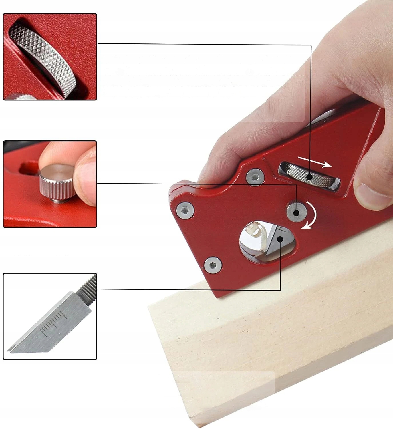 🚗【Инструкция по использованию】 Мы рекомендуем затачивать, хонинговать и полировать лезвие во время использования. Глубина строгания регулируется ручкой, от мелкой до глубокой. Не увеличивайте чрезмерно глубину строгания и не прекращайте строгание под углом, чтобы обеспечить более гладкую поверхность древесины после строгания кромок.