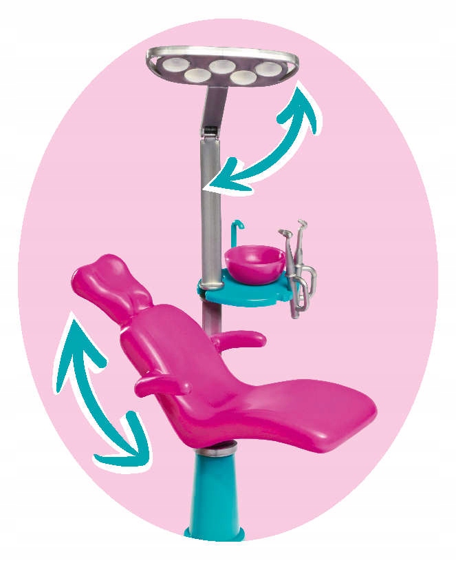 Набор прикреплен к Little Doll Boy с каштановыми волосами и красивой улыбкой. Кукла находится на зубном кресле Burquoise Pink , под лампой. набор. Есть: кружка, зубная паста, кисть, чаша и инструменты. : Puppet Steffi Dentist + аксессуары