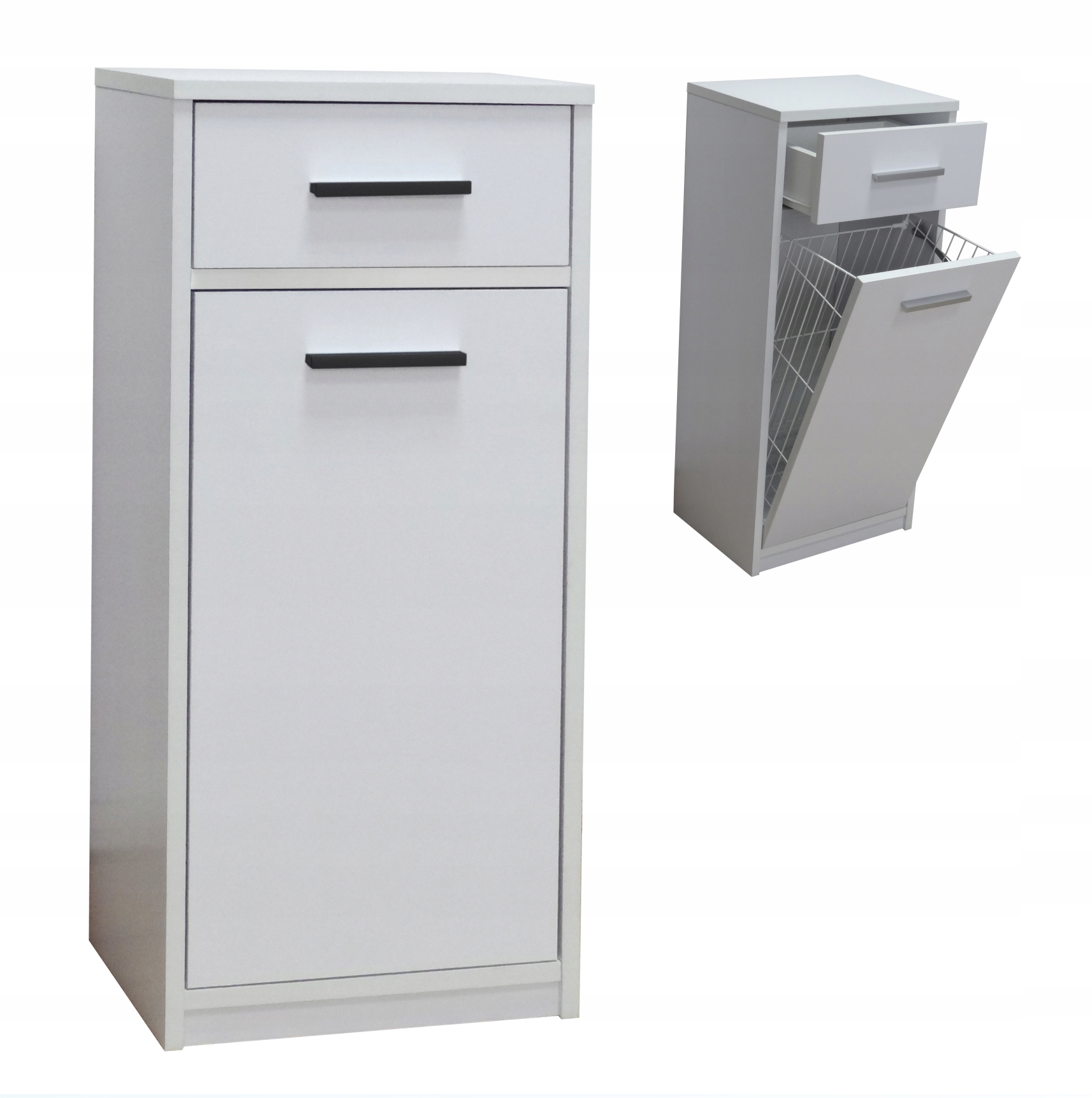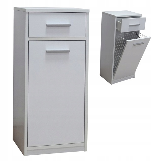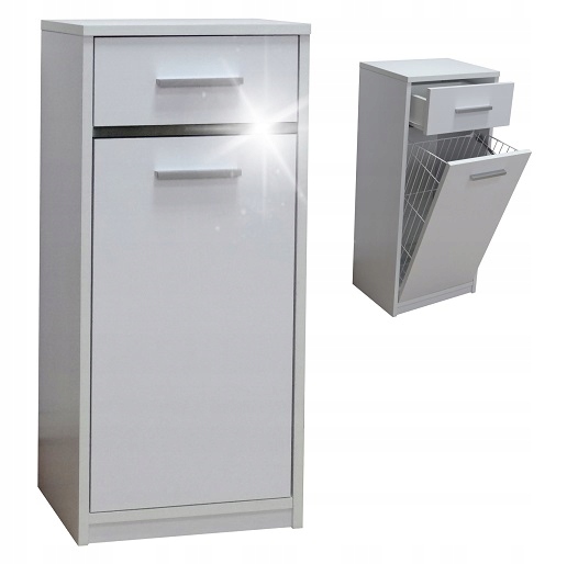Вместительный шкаф, ширина 40 см. Имеет вместительный выдвижной ящик и распашную дверцу с установленной корзиной для белья. Шкаф покрыт кромкой ПВХ для повышения влагостойкости. Шкаф имеет четыре цвета ручек на выбор: алюминий, хром,черный или золотой. Благодаря своей вместительности шкаф позволяет спрятать множество вещей.