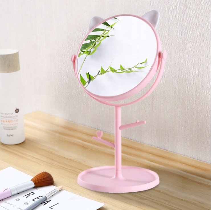 Зеркало с кошачьими ушками красиво выглядит и идеально вписывается в домашний туалетный столик, облегчая нанесение идеального макияжа и прически.