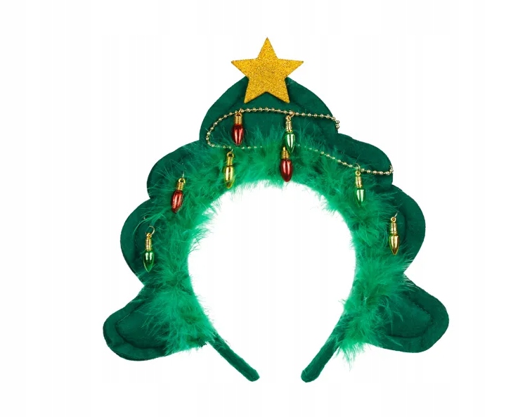 Повязка на голову «Елка» 18,5 Это радостный и впечатляющий аксессуар, который идеально подходит для встреч в сочельник, рождественских вечеринок, вертепов или фотосессий. Повязка на голову украшена яркими украшениями и золотой звездой наверху, что делает ее привлекательной и вызывает улыбку на лице.
