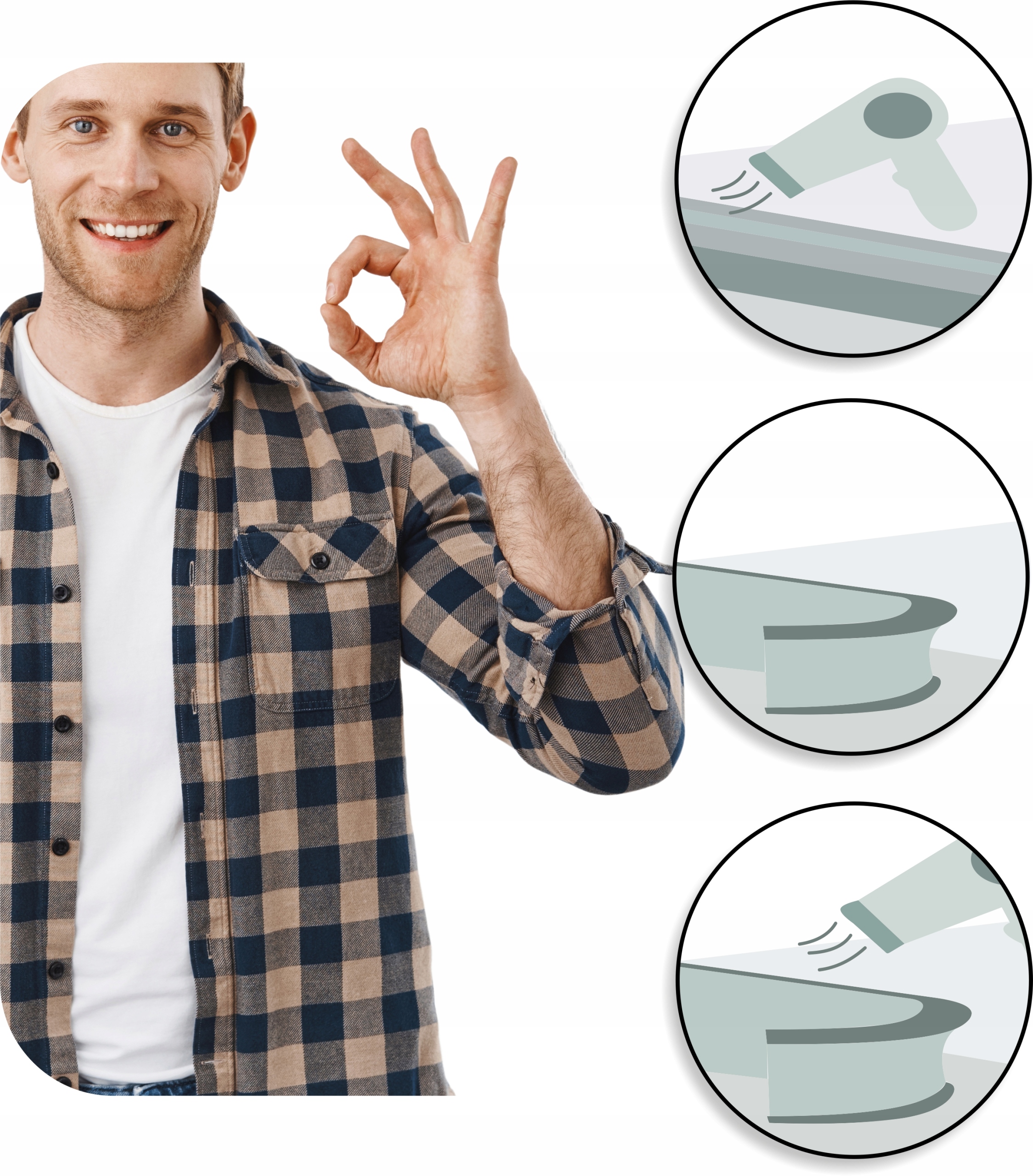 Просто очистите поверхность, отрежьте ленту нужной длины, снимите защитную ленту из фольги и приклейте ленту к краям. мебель.