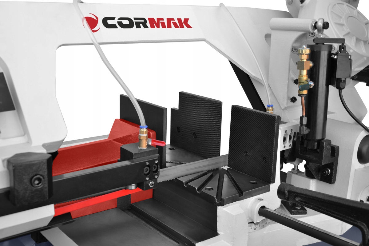 Ленточная пила CORMAK G5025, благодаря оснащению гидравлическим цилиндром, охлаждением и поворотным рычагом от L 45° до P 60° в сочетании с пильными полотнами известной немецкой компании Rontgen, широко используется там, где важна точность, качество и скорость резания.
