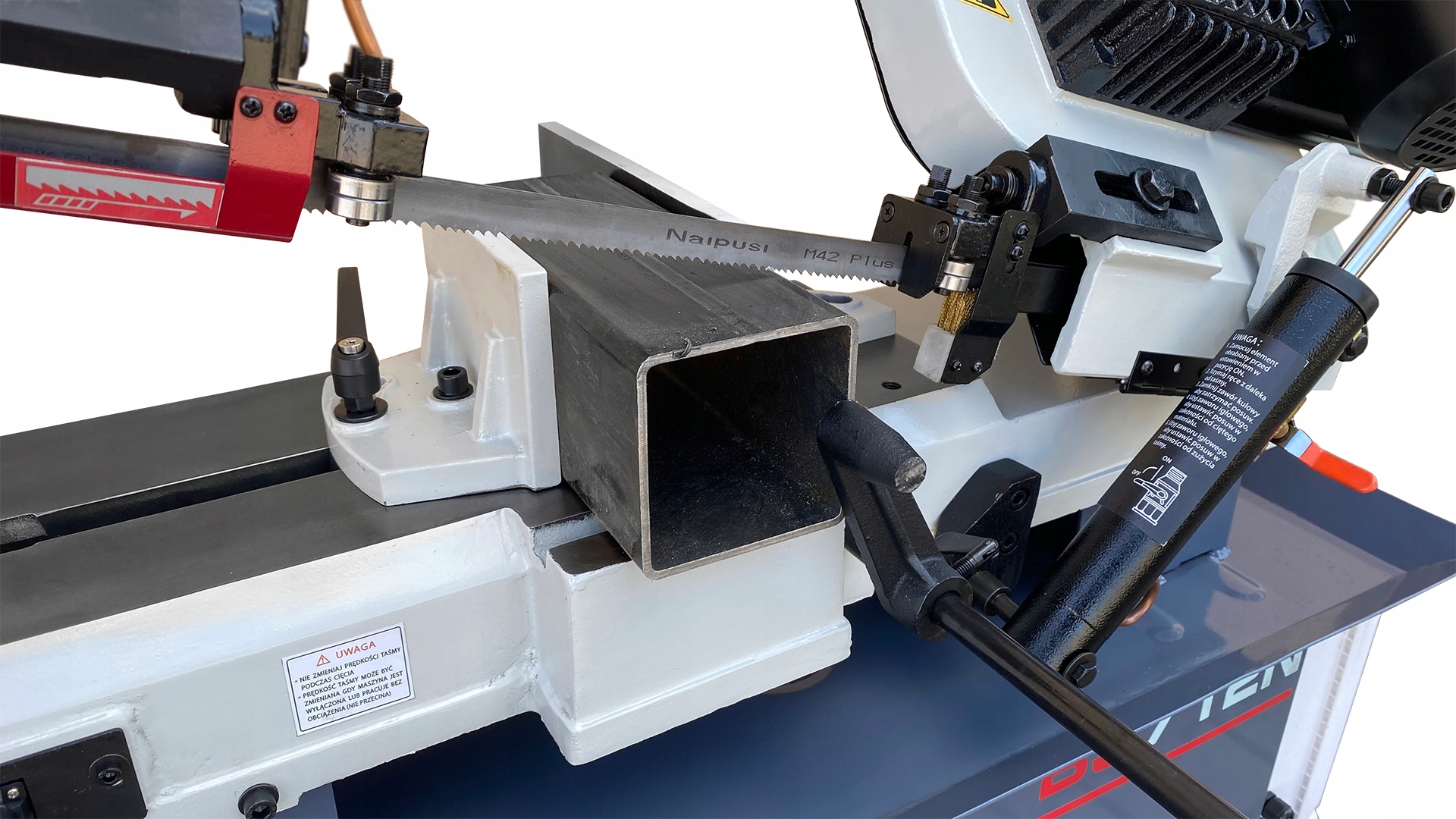 Кроме того, наша модель машины, в отличие от конкурентов, оснащена с проволочной щеткой, которая очищает режущую ленту от стружки – это предотвращает засорение пильного полотна и повышает эффективность резки.