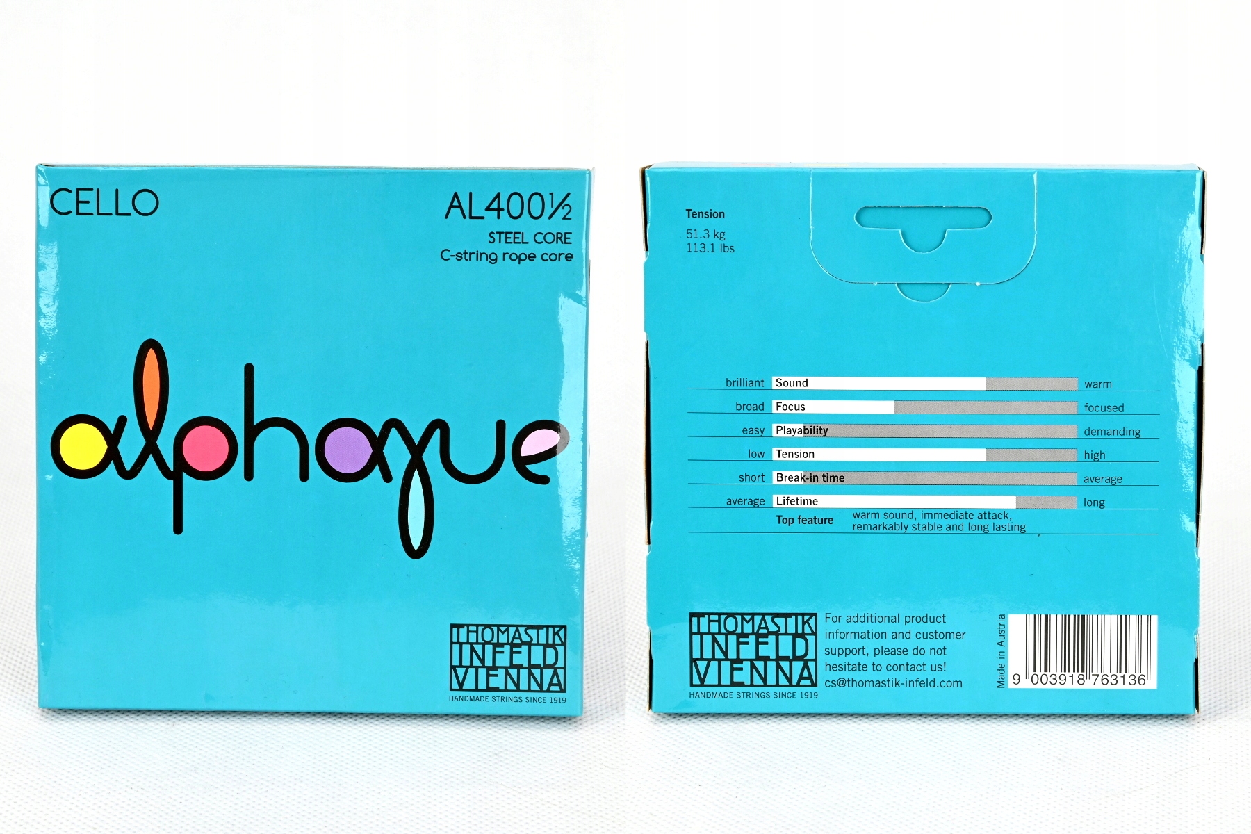 - пункт списка: sehr preisgünstige Einsteigersaite mit Synthetikkern, leichte Ansprache und mühelose Modulation, Spannung medium, A: Stahlkern, Hydonaliumumwicklung, D: Stahlkern, Speziallegierung, G + C: Seilkern, Chromstahlumwicklung