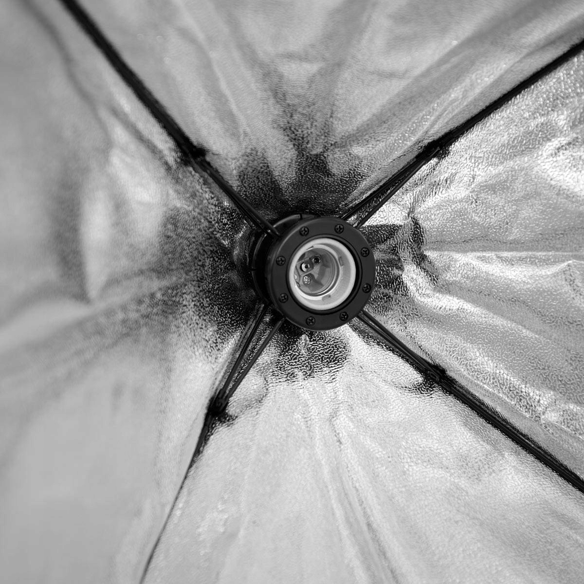 Используемый светильник представляет собой СОФТБОКС, интегрированный с цоколем E27, предназначенный как для ламп-вспышек, так и для ламп постоянного света. Балдахин размером 40х40 см внутри отделан серебристым материалом. Свет равномерно распределяется внутри софтбокса и сохраняет одинаковую мощность по всей поверхности рассеивателя. Внешняя поверхность софтбокса матово-черная, поэтому она не отражает свет других ламп.