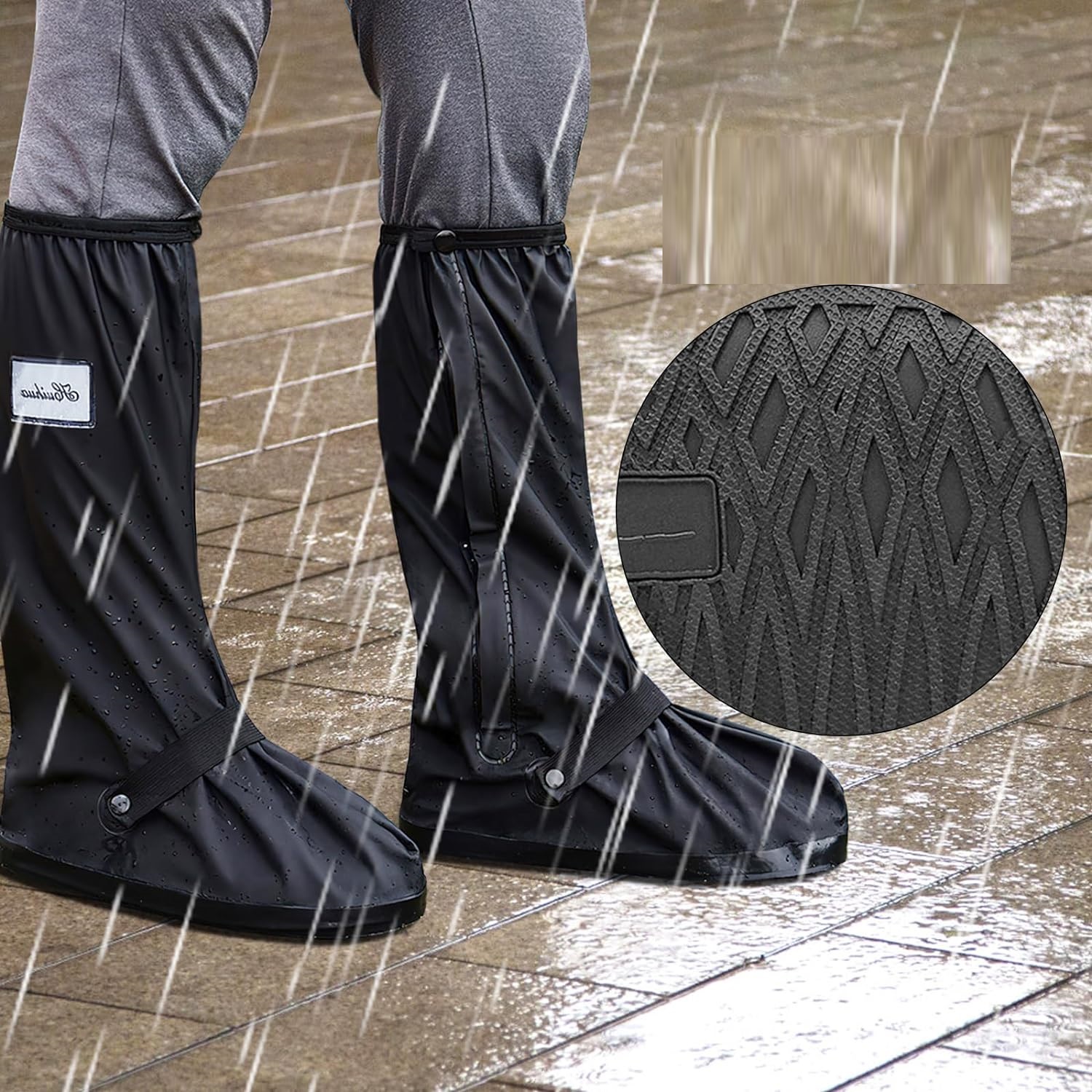 Регулируемая эластичная пряжка: водонепроницаемая обувь имеет эластичную регулируемую конструкцию, подходящую для большинства размеров обуви. В верхней части пятки имеется эластичная лента с пряжкой, которую можно отрегулировать в соответствии с вашими предпочтениями, чтобы она лучше облегала обувь. Высота дождевиков этих бахил составляет 40 см. Они защищают большую площадь ног. Чехлы для обуви от дождя также легкие, и их легко брать с собой в дорогу.