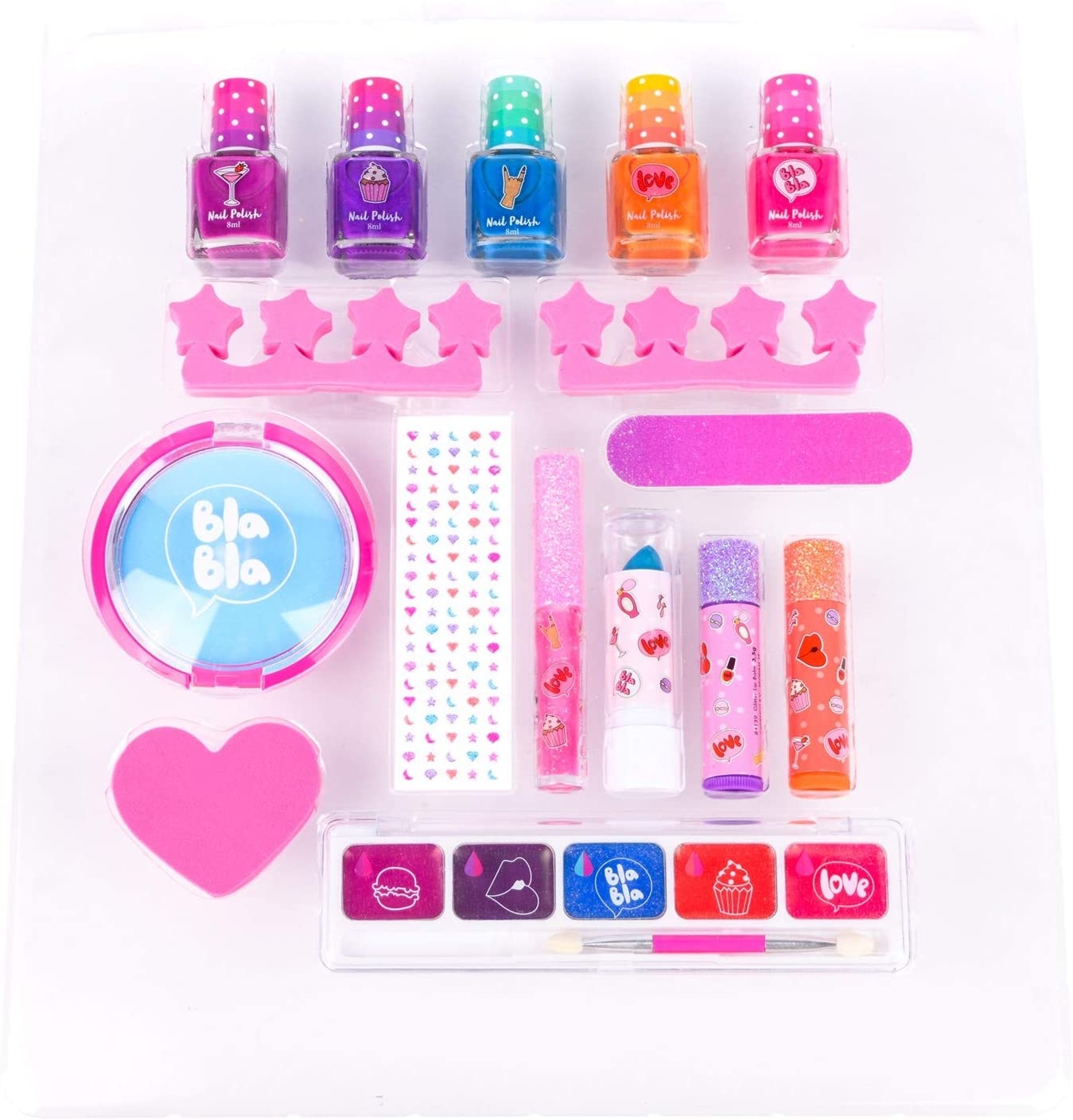 Creative набор косметики содержит помаду, 3 блеска для губ, 5 лак для ногтей, поддон с 5 тени для господства, разделители для картины для ногтей, набор блестящих наклеек и чал с толчком. Все в оттенках розового, синего и фиолетового. Создайте это косметика! Они прочные, блестящие и безопасные для детей.