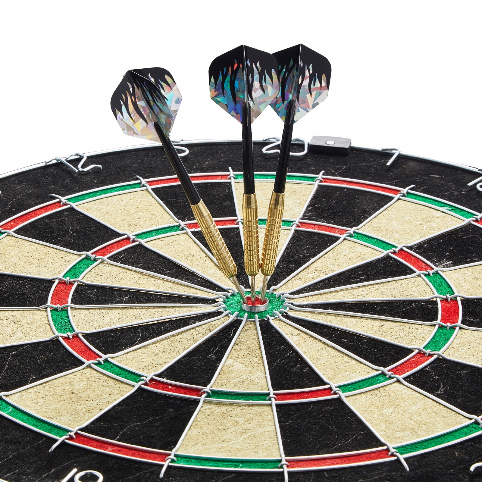 Классический подсчет очков. С легкостью отслеживайте свою игру с помощью классического черного табло, которое легко стирать. В комплект для дартса и доски для дартса входят высококачественные дротики со стальными наконечниками, канавками и кольцами для надежного захвата, а также держатели для хранения дротиков, когда они не используются.