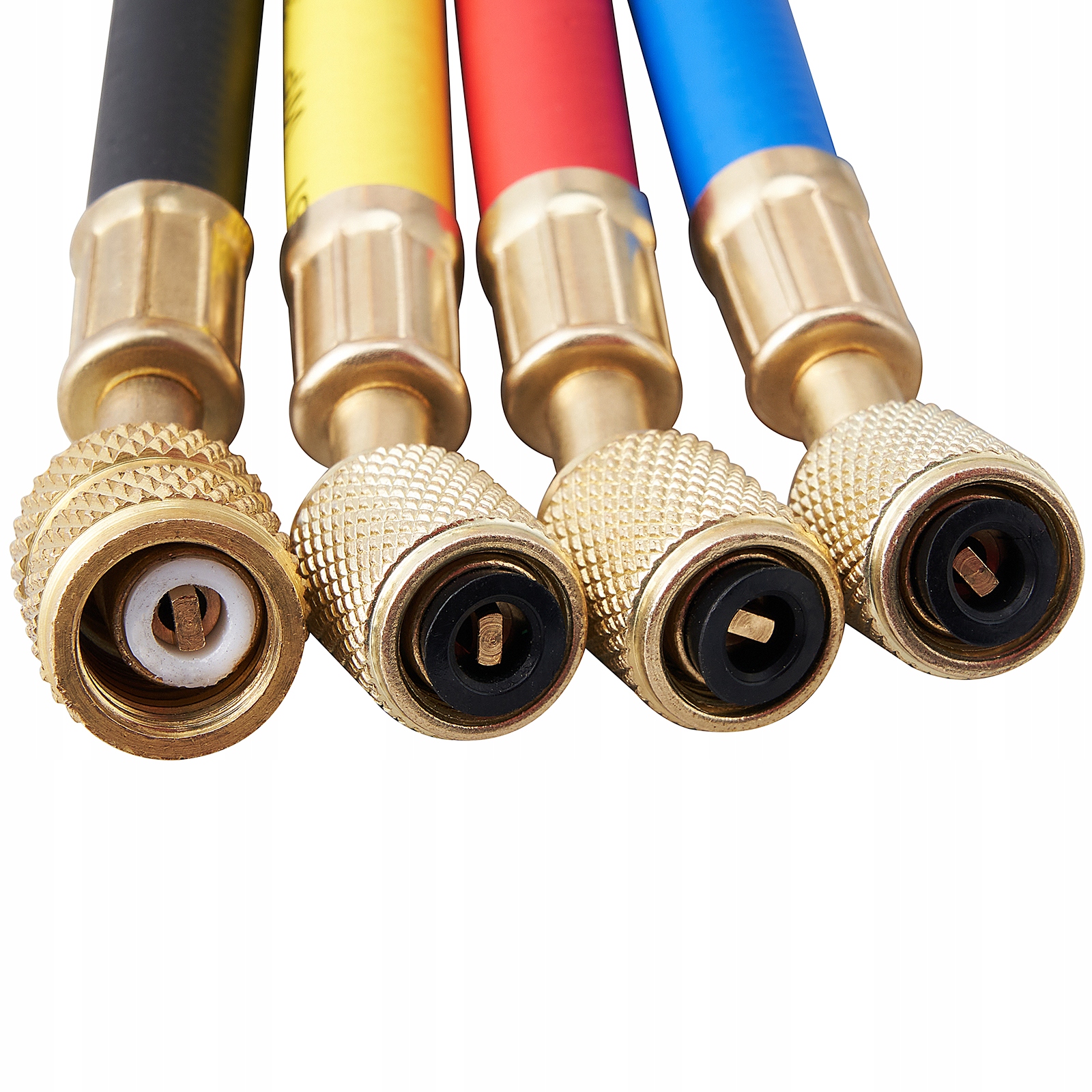 Набор из 4 армированных шлангов: Наши сверхдлинные фреоновые шланги длиной 5 футов (152,4 см) поставляются в наборах по четыре штуки и изготовлены из ПВХ с четырьмя слоями армирования. Они могут выдерживать давление до 800 фунтов на квадратный дюйм с давлением разрыва 4000 фунтов на квадратный дюйм. Кроме того, соединители шлангов оснащены нескользящими уплотнениями, которые предотвращают ослабление во время работы, что значительно снижает риск утечек и загрязнения.