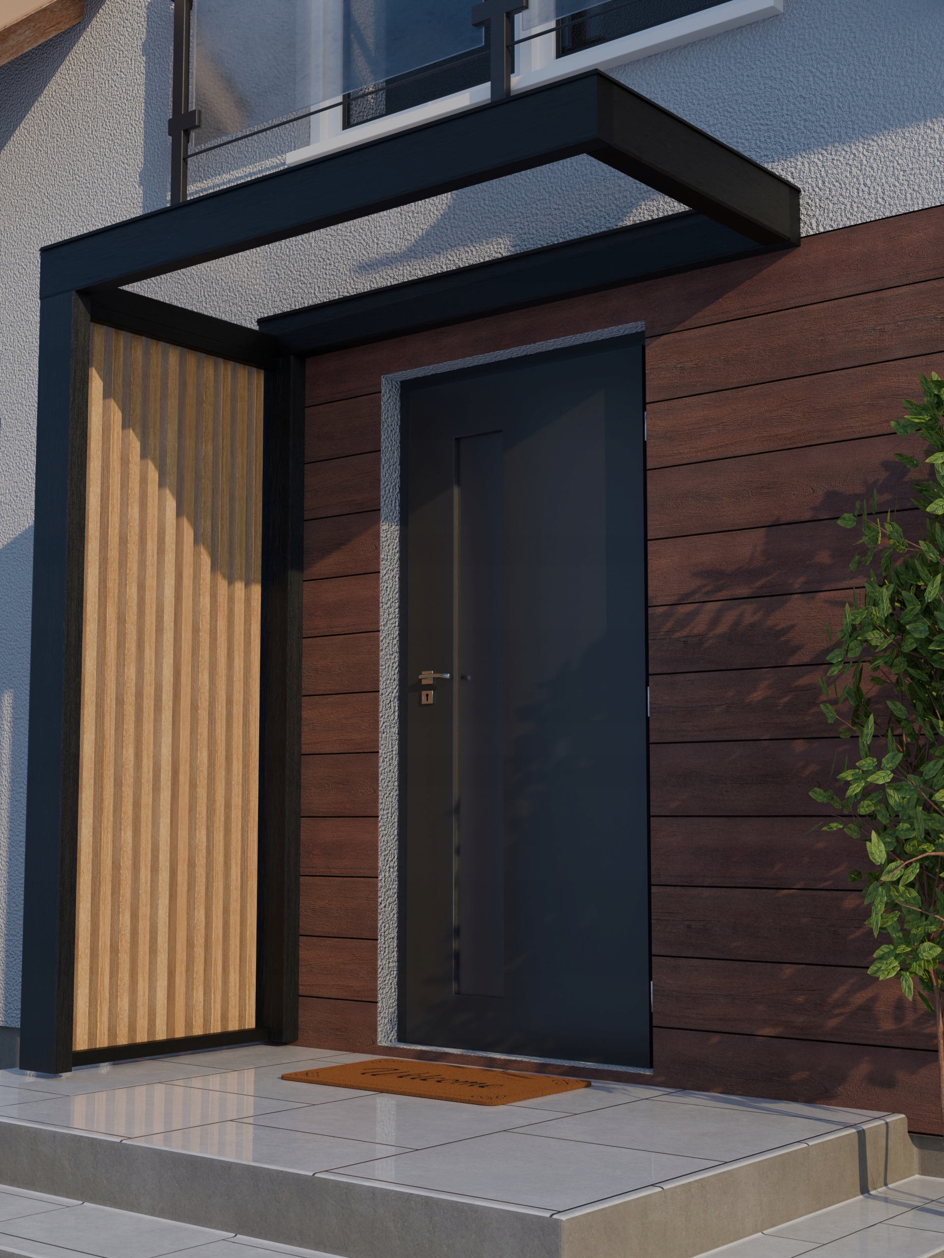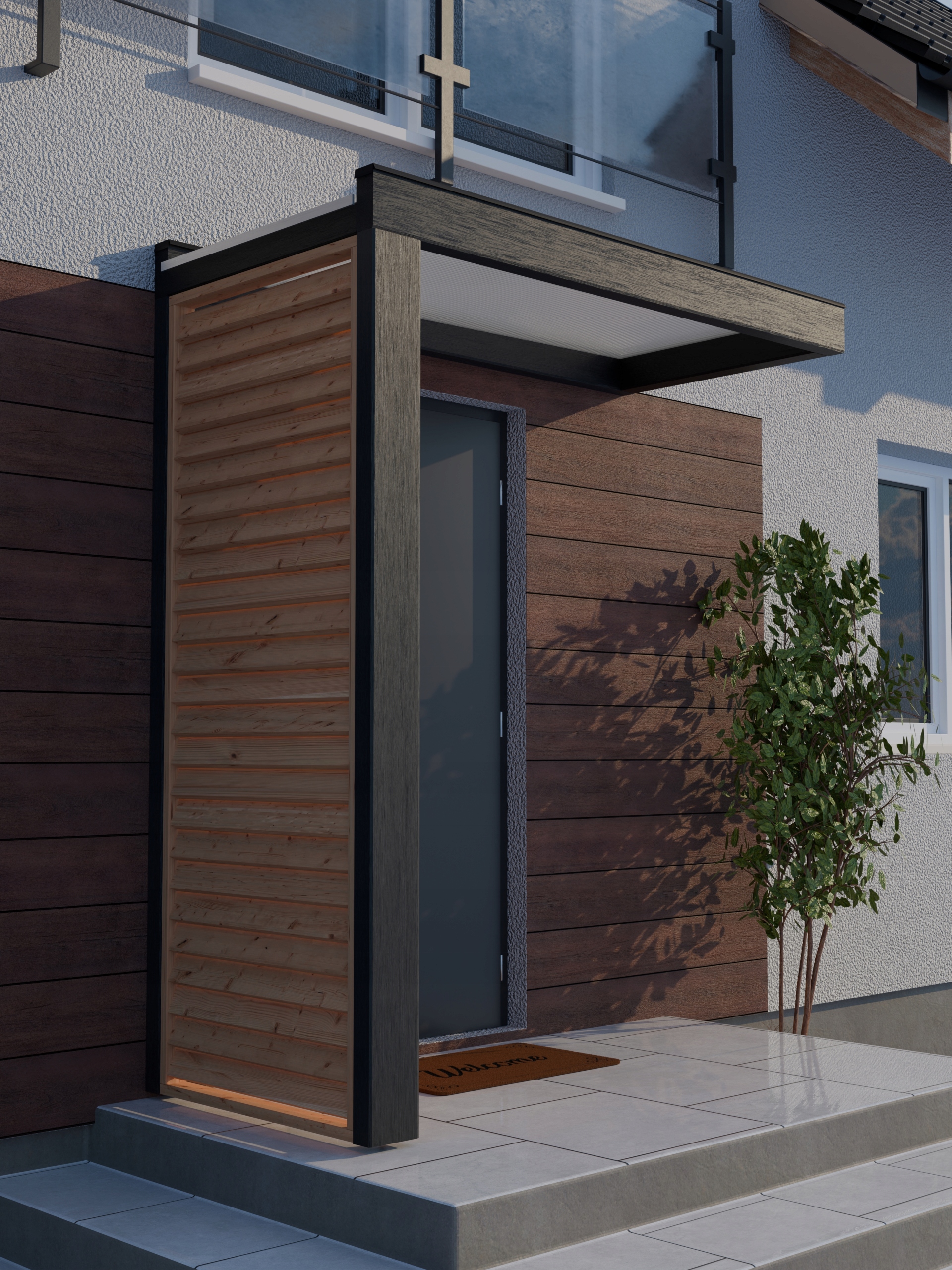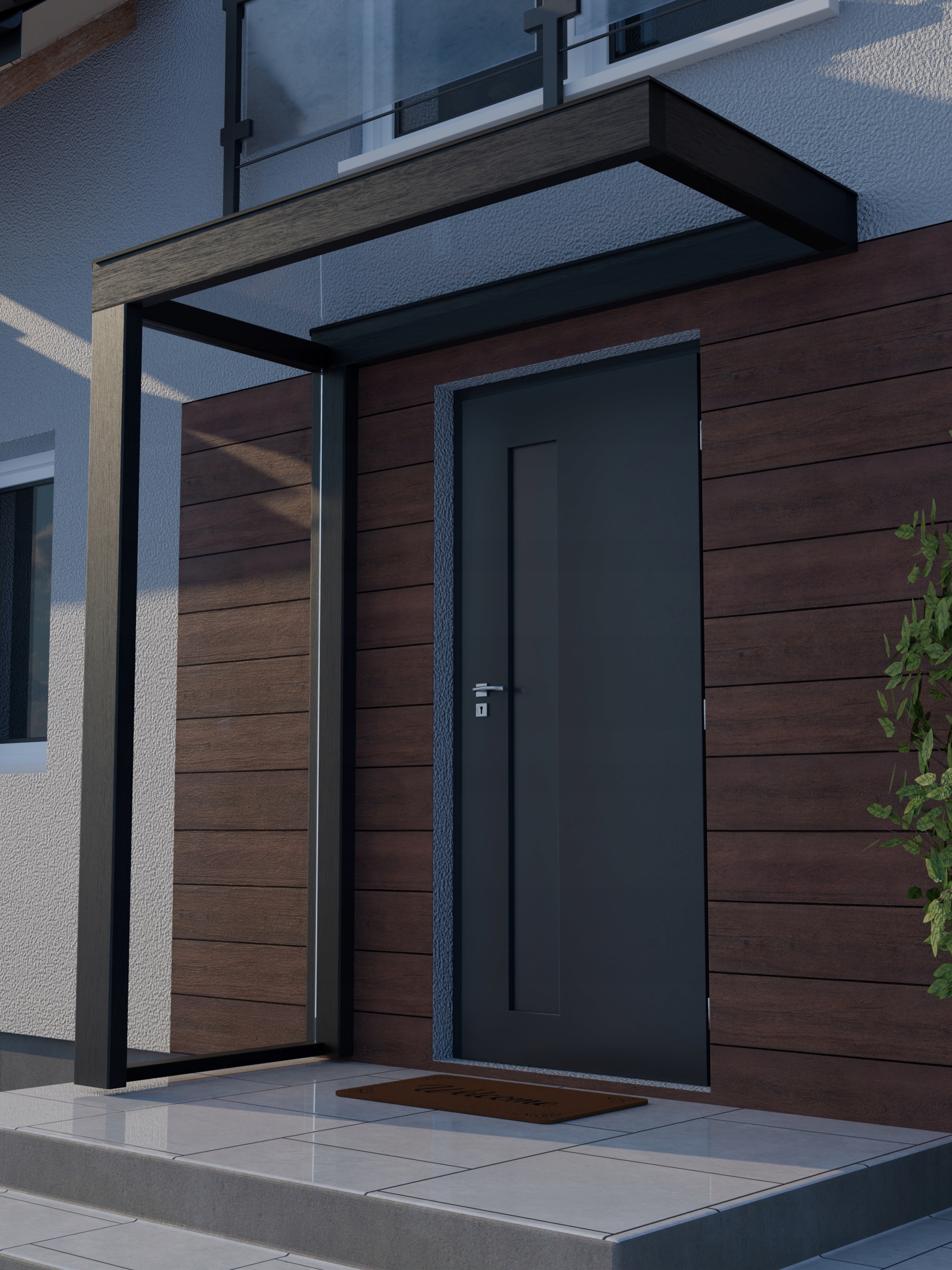 Современная и массивная кровя над входной дверью. Благодаря современному дизайну и увеличению пересечения элементов мы получаем абсолютную долговечность, безопасность и внешний вид в течение следующих лет.