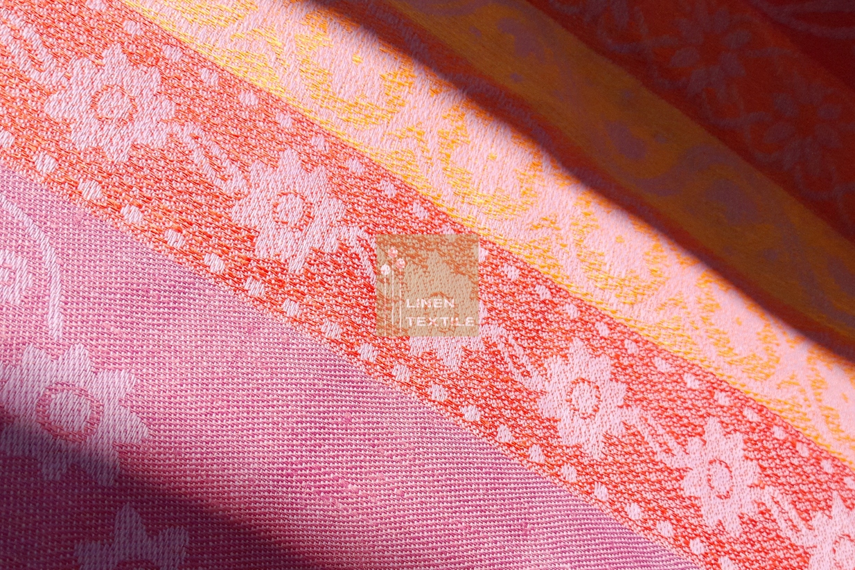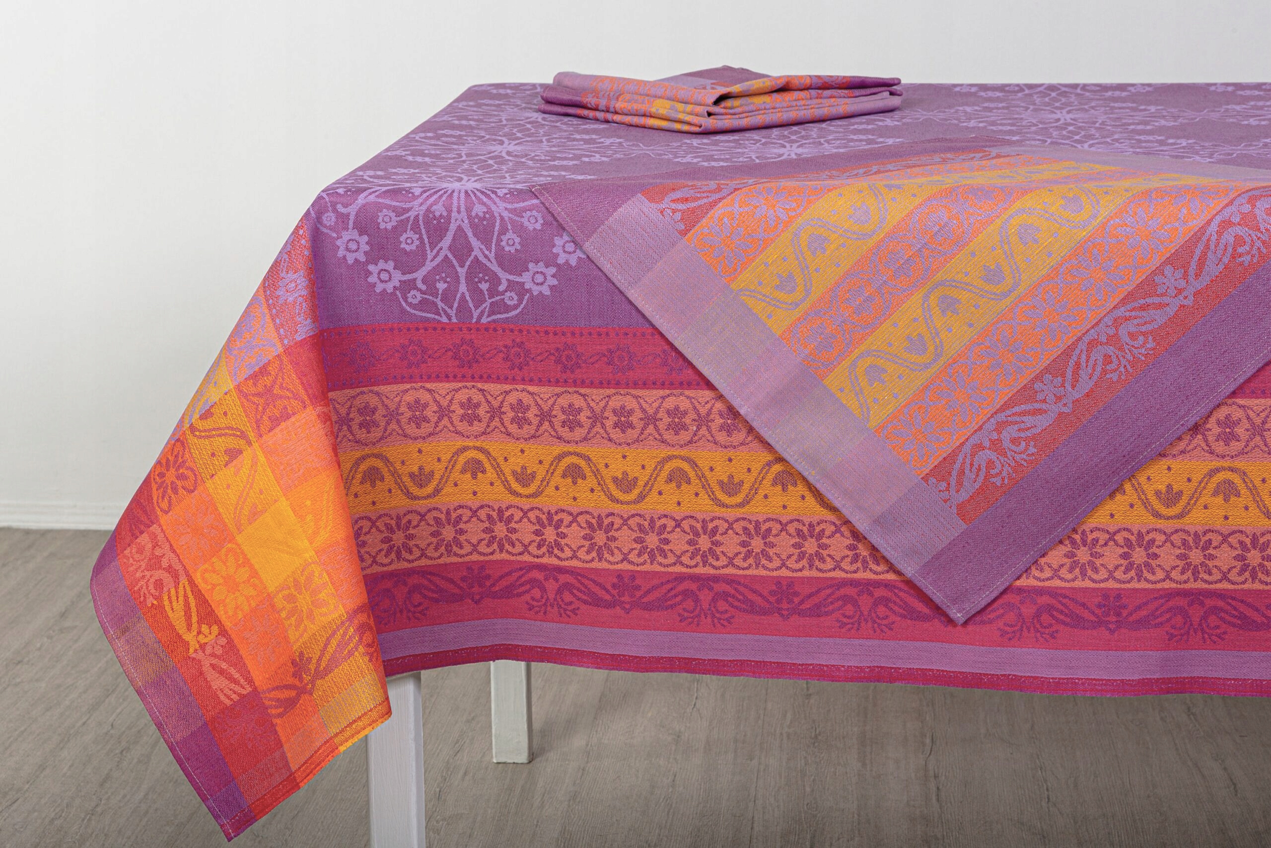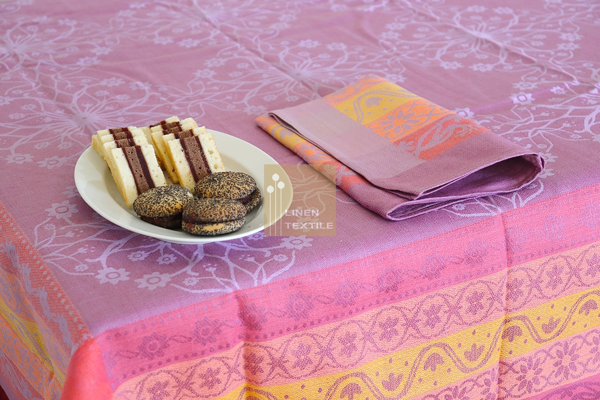 В комплект современной скатерти с цветами Гладриэль входит большая скатерть 180х255 см и 6 салфеток из льняно-хлопкового жаккарда. ткань. В цветах здесь преобладают приглушенный фиолетовый и осенние оттенки красного, желтого и оранжевого. Фантастический переплетенный цветочный узор привлекает внимание. Скатерть с салфетками добавляет элегантности интерьеру, но и обогащает его благодаря своей оригинальности. Прекрасное предложение для роскошного подарка.