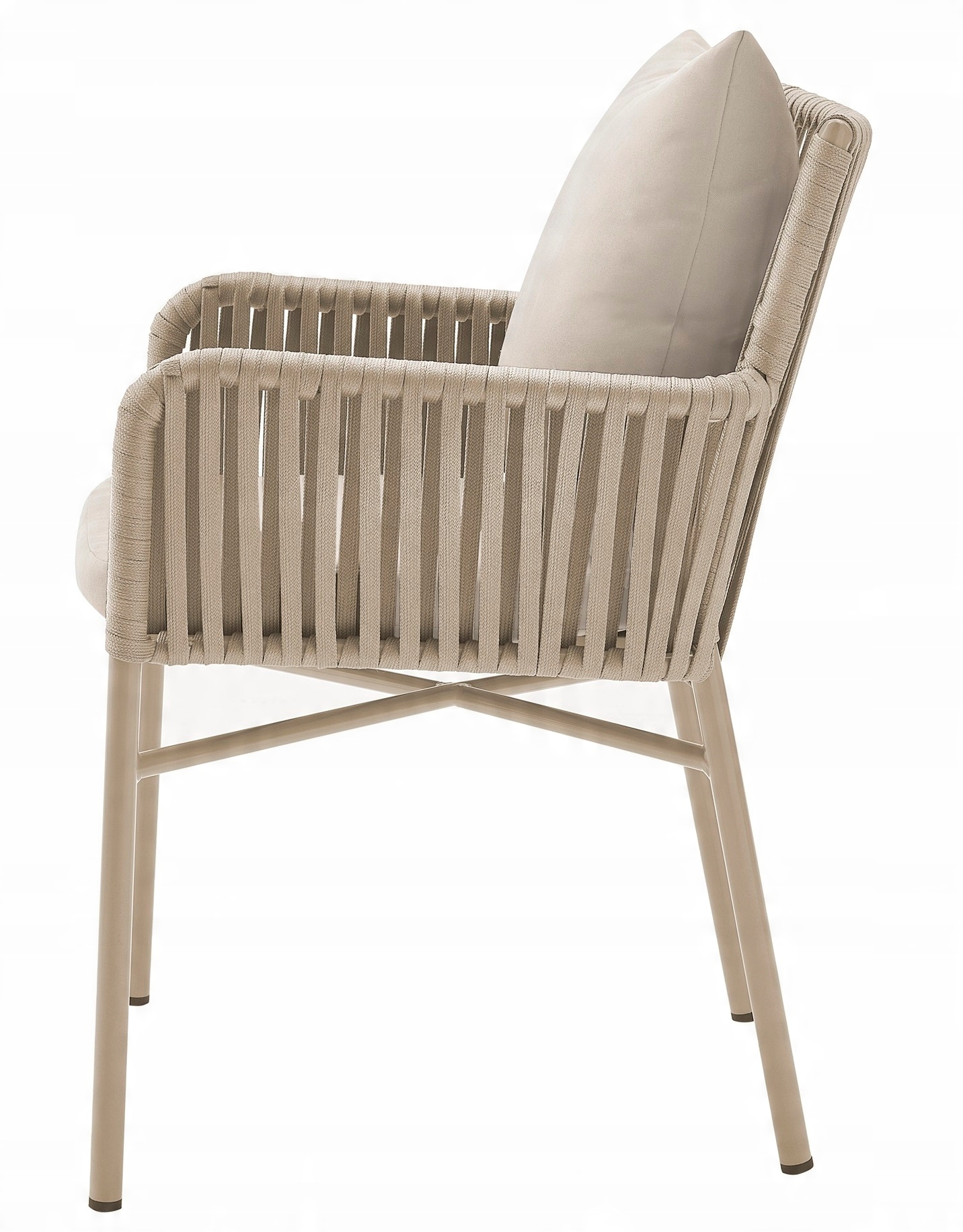 рама стула изготовлена из порошкового алюминия - легкий, и в то же время прочный металл, который намеренно сдает экзамен во требовательной внешней среде. Подлочих идут плавно в спинку, создавая впечатляющее целое. Металлическая рама дополняется стильной оплеткой и мягкими подушками. Материал класса премиум -класса не поглощает воду или загрязнение и не исчезает, несмотря на долгосрочное воздействие острых солнца.