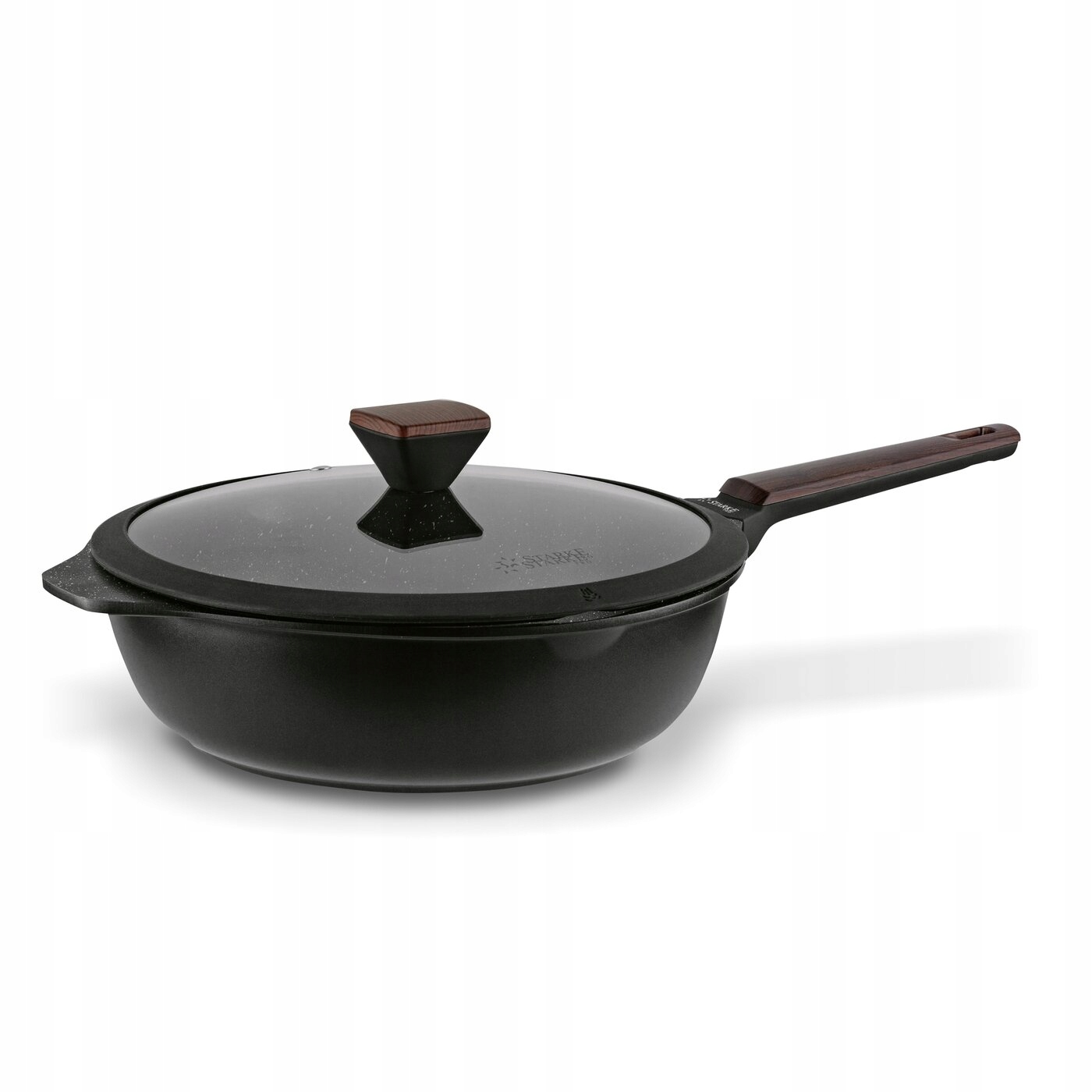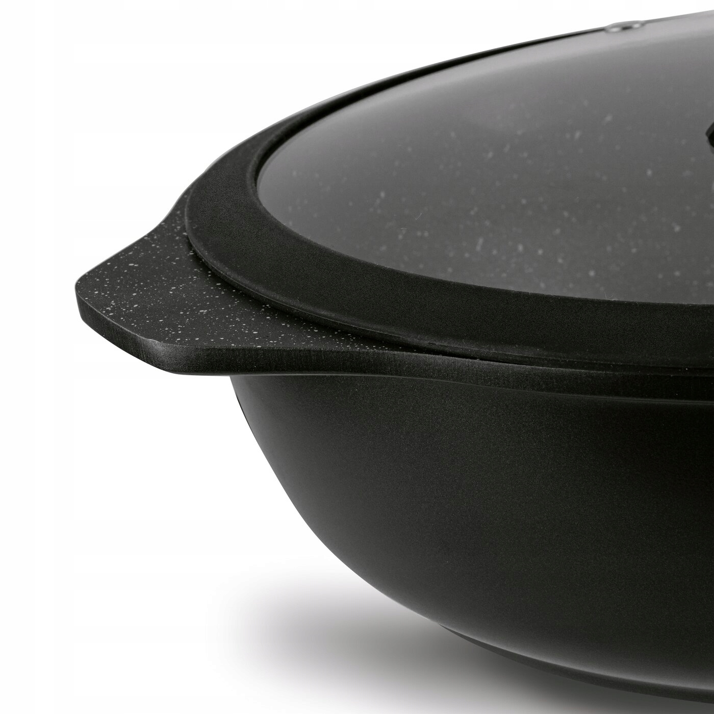 Дополнительная информация: кастрюли и сковородки из кованого алюминия с покрытием Marble Plus, имеющим естественную шероховатую текстуру с высокой адгезией и отличной устойчивостью к истиранию и царапинам, - трехслойное покрытие, черного цвета. с блестящими частицами, - 10 000 циклов истирания, - толщина дна: 3,2 мм, - толщина стенки: 2,0–2,8 мм, - толщина края: 4 мм, - нескользящие ручки Soft Touch, - без ПФОК, - стеклянная крышка с силиконовой кромкой и вентиляционное отверстие из нержавеющей стали, только ручная стирка