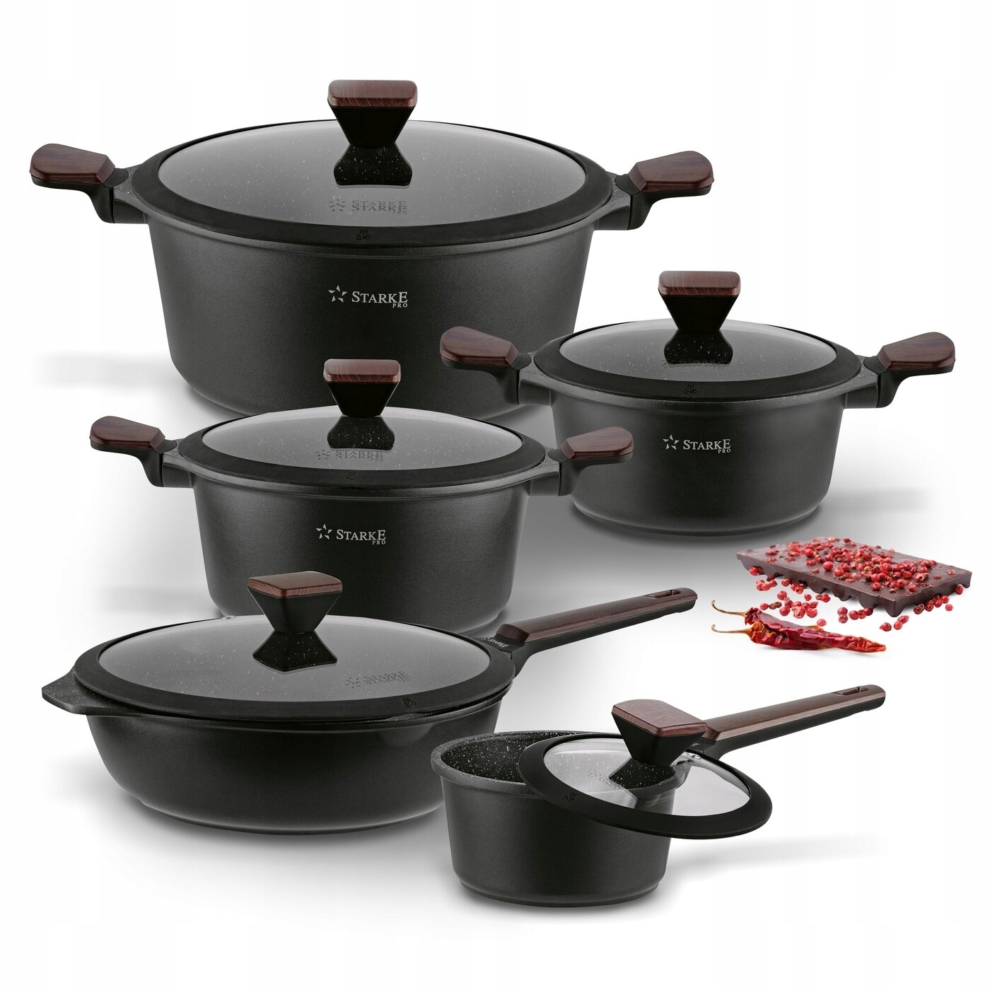 Стильный набор мраморных индукционных кастрюль Starke Pro Redwood из 10 предметов изготовлен из алюминия. Для его создания использовалась технология гомогенного литья под давлением. Благодаря этому посуда идеально сбалансирована и очень прочна по механическим и термическим свойствам. Внутренняя часть кастрюль, сковородок и сотейников отделана каменным антипригарным гранитным покрытием MARBLE PLUS. Его высокое качество, твердость и трехслойная структура не содержат токсичных веществ. Имеет маркировку PFOA Free, поэтому полностью безопасен для здоровья и окружающей среды. Экономию энергии обеспечивает индукционное дно, которое нагревается эффективно и равномерно. Благодаря этому посуду серии Redwood можно использовать на любой плите. Антипригарное покрытие мраморного типа также позволяет жарить с небольшим количеством жира и упрощает уход. Она выдерживает до 10 000 циклов истирания, что в пять раз больше, чем у обычной посуды с антипригарным покрытием, доступной на рынке. Крышки с силиконовым ободком и незаметная система регулирования количества пара внутри сосудов – кастрюль, сковородок и кастрюль – позволяют тушить ингредиенты. Переносить и использовать набор облегчают мягкие на ощупь ручки, которые не нагреваются и не выскальзывают из рук. С его помощью можно создать разнообразный набор кухонной утвари из серии Redwood – для домашнего использования их рекомендует Петр Кухарский, лично проверивший их возможности и качество. На комплект распространяется гарантия 5 лет!