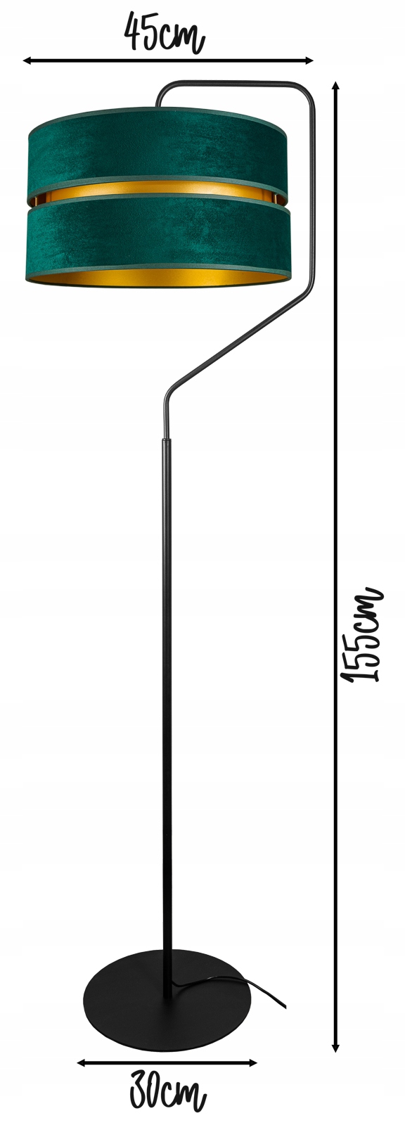 Торшер современный – черного цвета с абажуром из велюровой ткани в модном лофтовом сочетании бутылочного зеленого и золотого. Дизайнерский стиль идеально впишется в ваш интерьер. Он дополняет потолочные светильники.