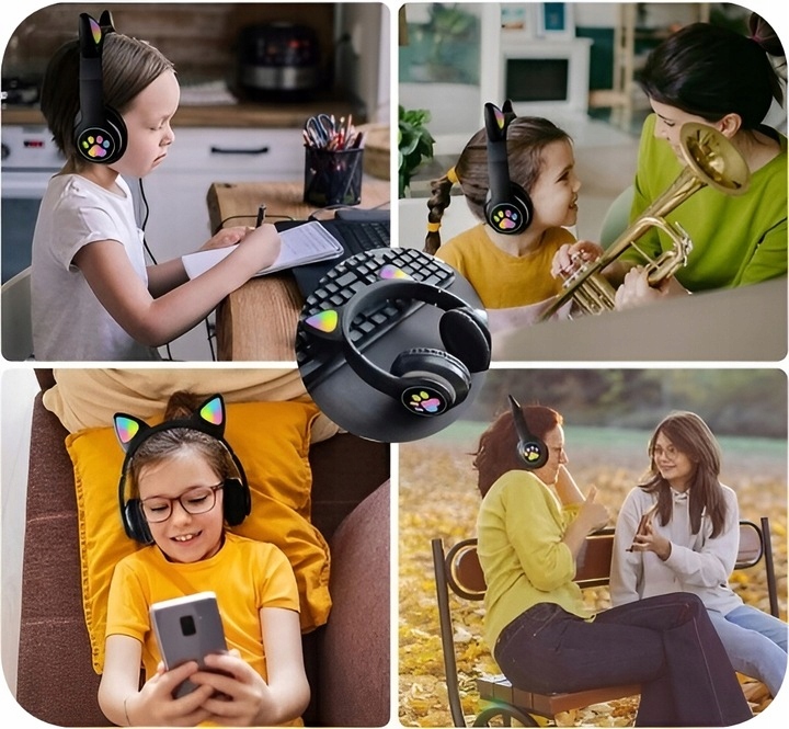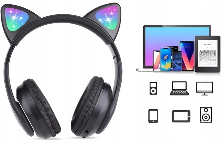 SŁUCHAWKI BEZPRZEWODOWE KOLOROWE KOCIE USZY LED DLA DZIECI