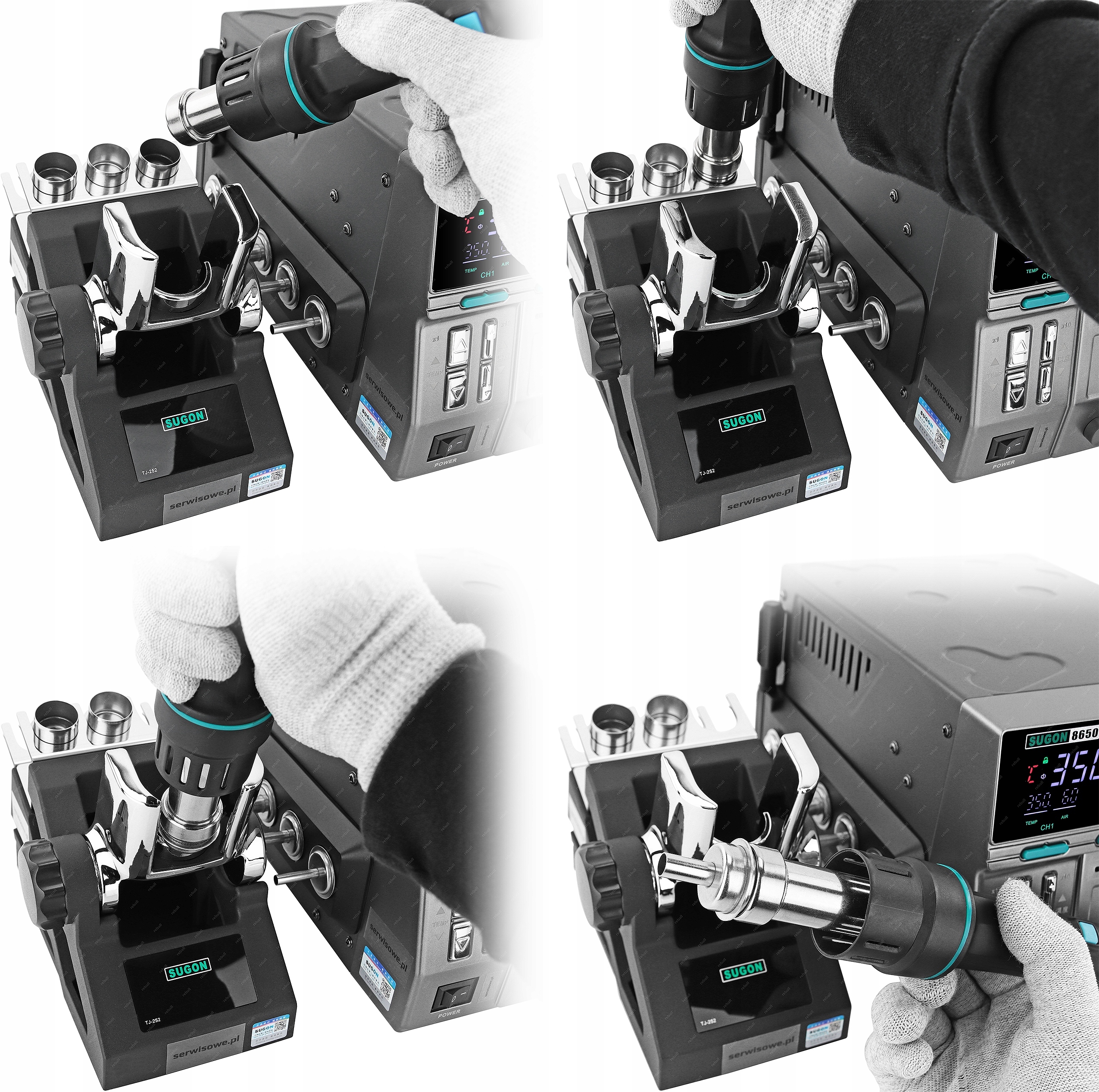 Паяльная станция оснащена высокотемпературной функциональной накладкой, позволяющей хранить до 5 насадок горячего воздуха.