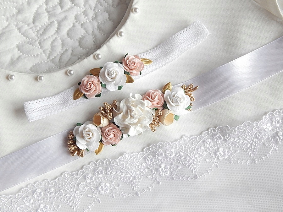 повязка на голову на декоративной белой эластичной, украшенной нежными цветами. Его схема в незаконном состоянии составляет около 36 см
