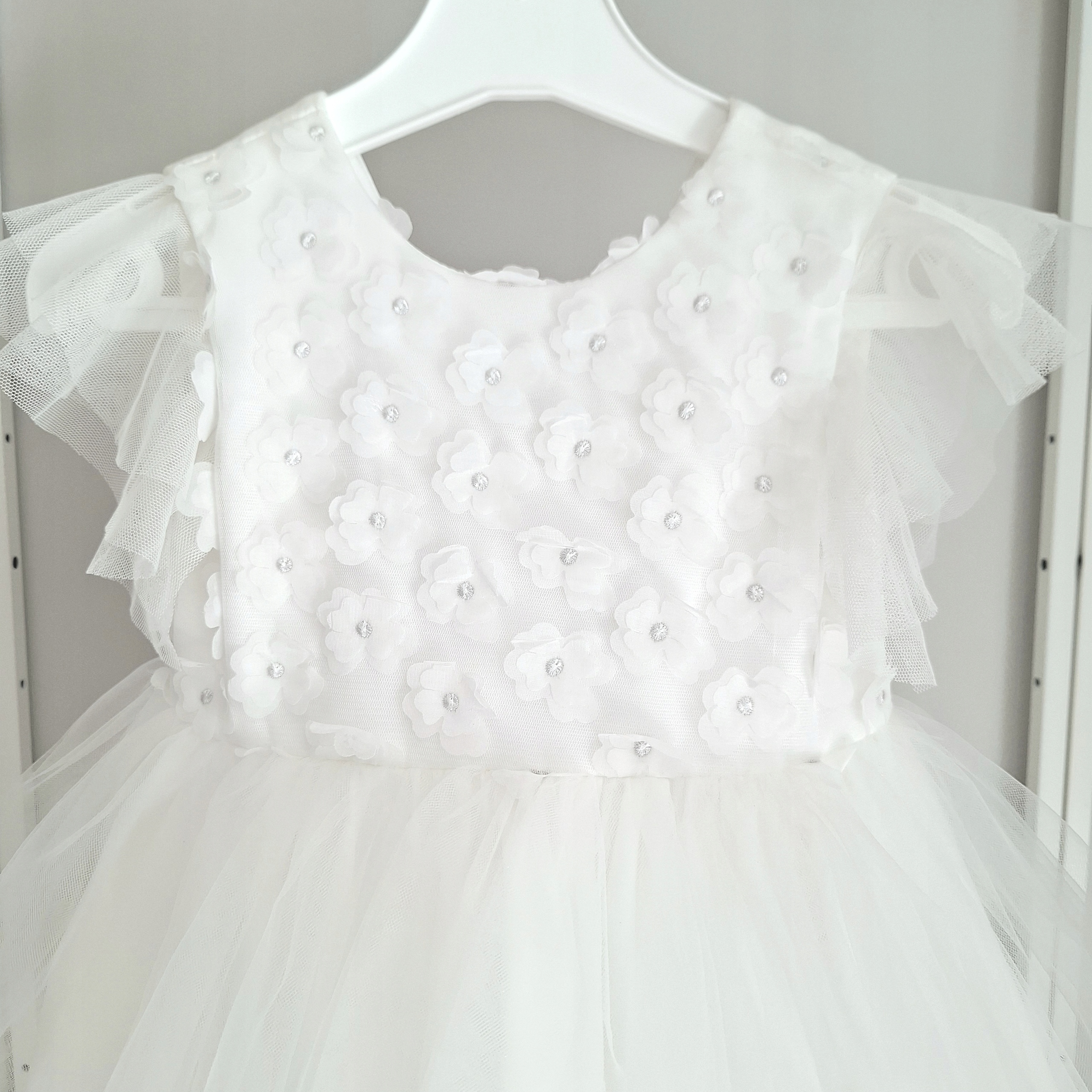 СУКНЯ ДІВЧИНКА З ТЮЛЮ НА ХРЕЩЕННЯ, ВЕСІЛЛЯ, РІК, 3D КВІТИ, БІЛА: 98