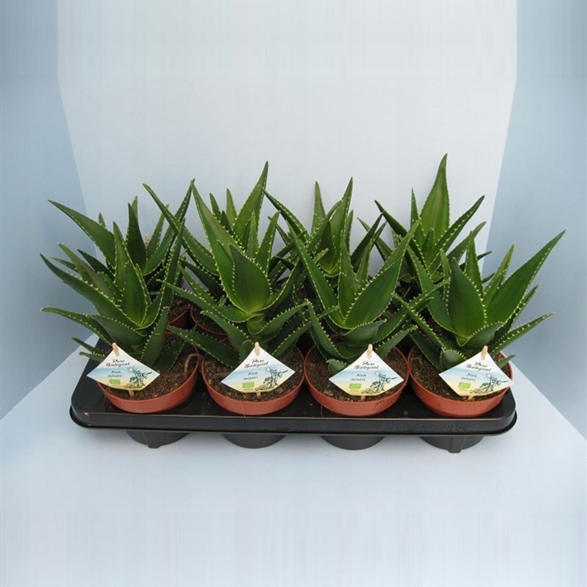 Очень известный и уважаемый вид алоэ вера из -за появления розетков. Он поступает из регионов Южной Африки, где охватывает не только плоские участки, но и наклонные или вертикальные скалистые расстояния в естественной среде, достигают до 2 метров, но в домашних условиях диаметр розетки составляет около 20 см. Листья алоэ мясисты, короткие, широкие, имеют треугольную форму и острые окончания. Они украшены белыми, гибкими выступами, которые напоминают шипы. С возрастом цвет "шипов" темнеет и становится темно -коричневым. Листья имеют очень хороший, интенсивный зеленый цвет, и на полном солнце они получают дополнительный голубоватый оттенок. Стоит позаботиться о солнечном положении для получения интересного цвета. Листья направлены на создание компактной розетки. Они легко и быстро сгущаются. Во время цветения он производит красные или апельсиновые цветы, но помимо естественной среды трудно их получить.