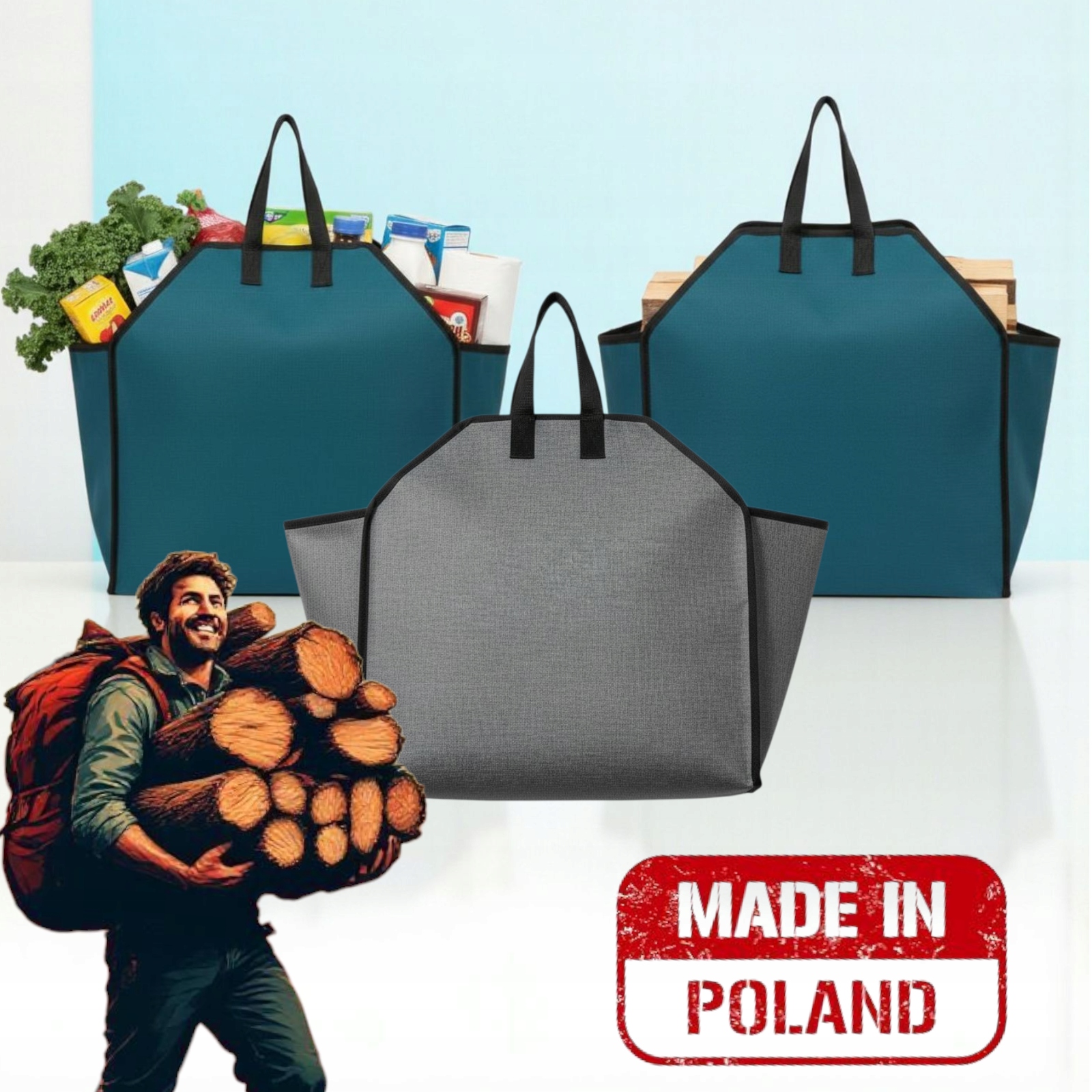 Прочная сумка емкостью 65 литров, изготовлена из плотного, жесткого полиэстера, имитирующего лен. Идеально подходит для переноски и хранения дров, брикетов или пеллет.
