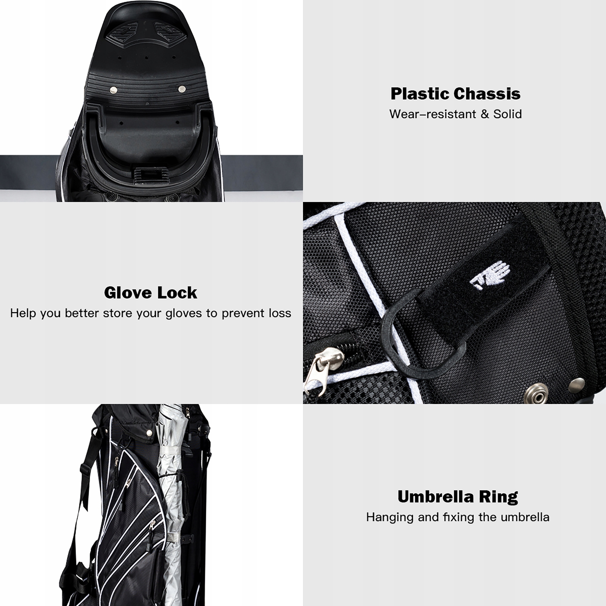 Большая емкость - сумка очень вместительна и предлагает очень большое место для хранения. Он имеет большой основной отсек для хранения с отсеками для гольфа и множеством дополнительных карманов (включая карманы для шаров и полотенц -Слппидки, которые обеспечивают безопасность на различных подложках