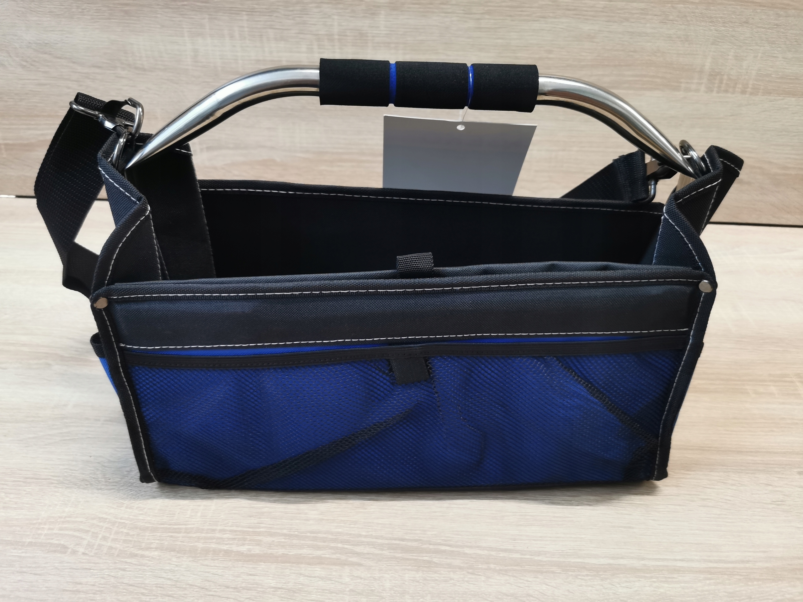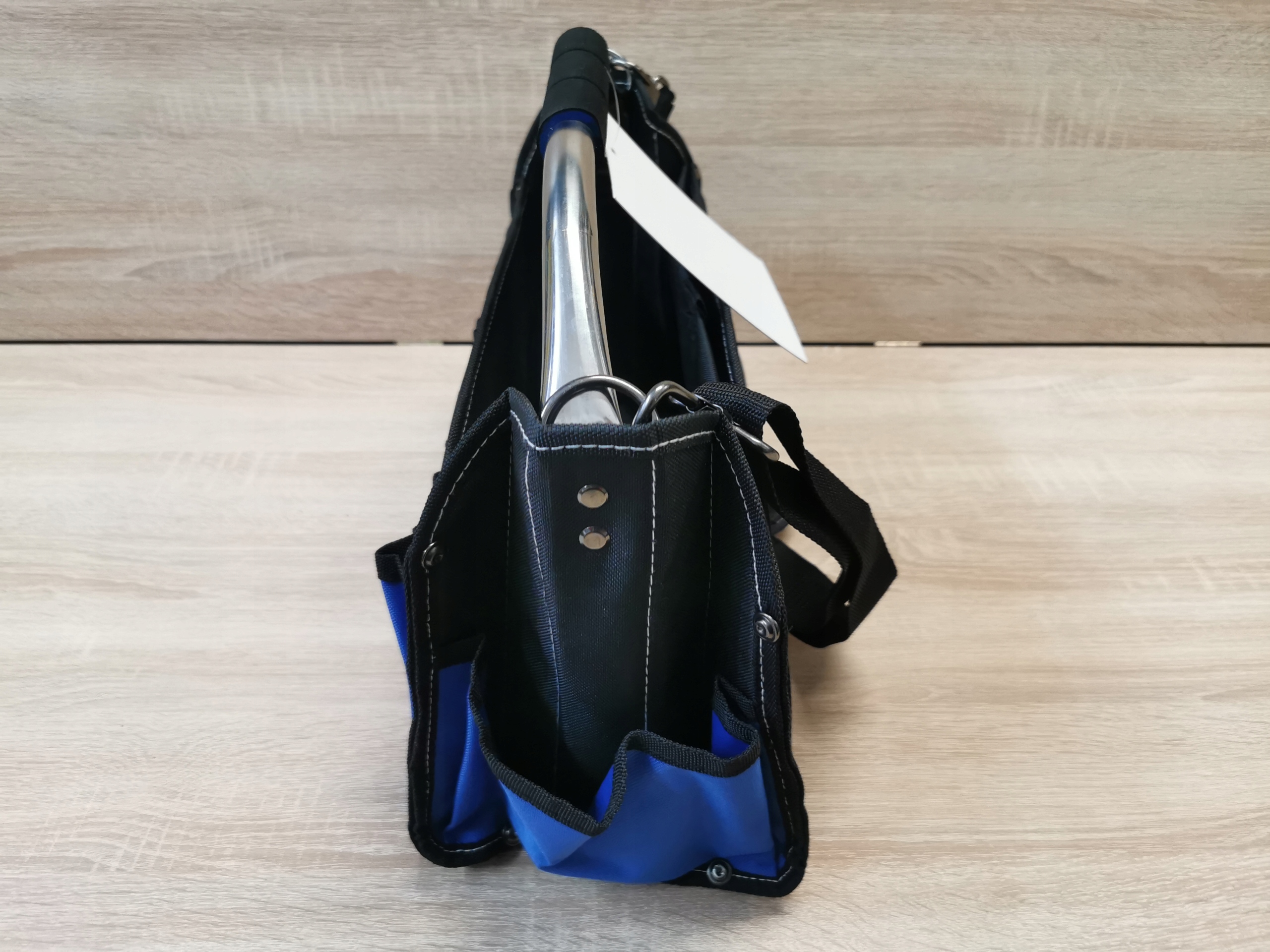 Открытая сумка для инструментов с металлической ручкой и 18 карманами.