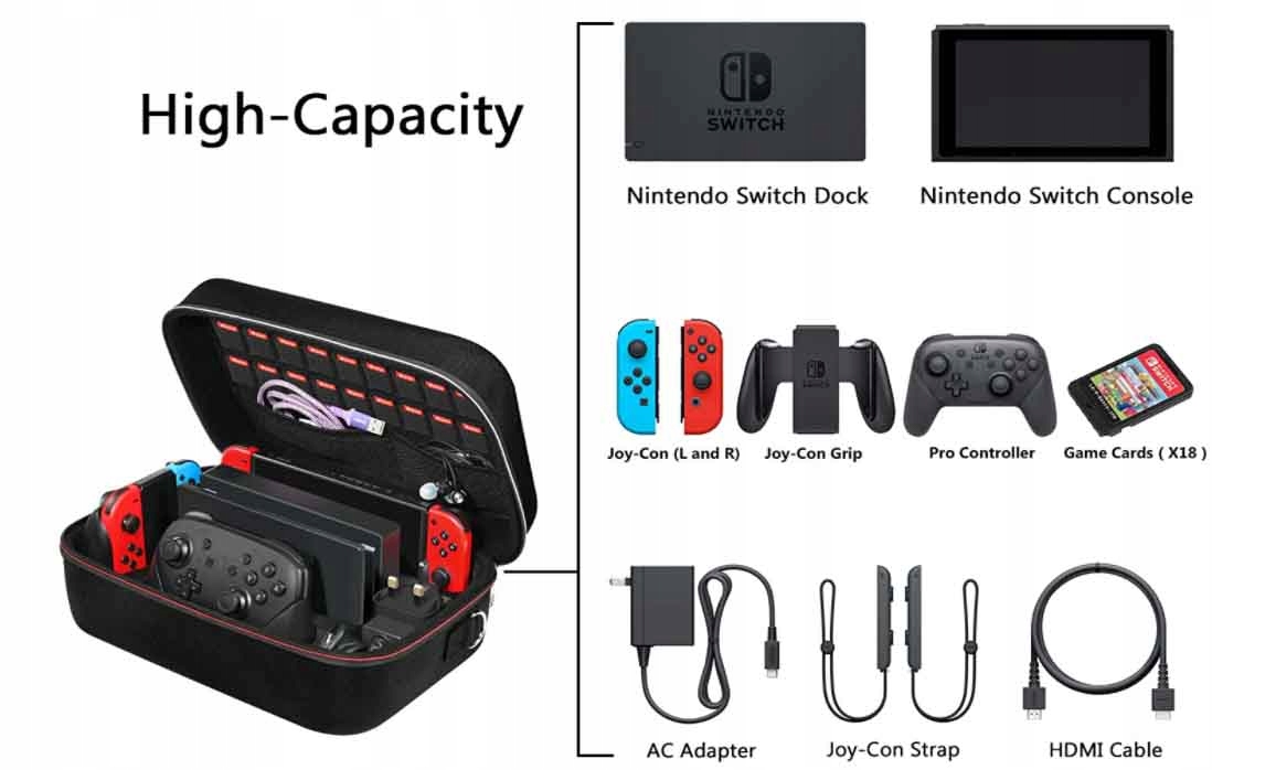 Внутренние карманы надежно удерживают вашу консоль Nintendo Switch, включая 2 контроллера Joy-Cons, док-станцию Nintendo Switch, зарядную ручку Joy-Con, адаптер переменного тока. Внутренний сетчатый карман для других небольших аксессуаров Nintendo Switch, таких как дополнительные Joy-Cons, кабель HDMI, ремни Joy-Con и т. д.