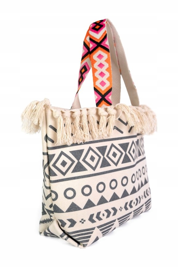 Большая тканевая сумка с ацтекскими узорами, отделанная бахромой.