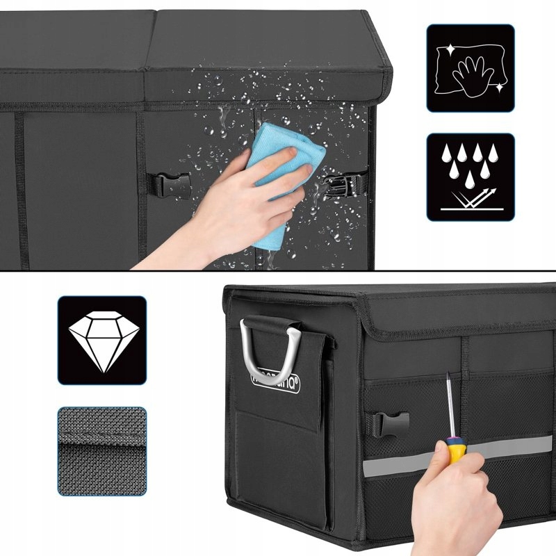 Объемом 63 литра он подходит для перевозки и хранения покупок, напитков, спортивных товаров, инструментов и спасательного оборудования. Сумка вмещает до 25 кг, легко чистится и устойчива к истиранию. Благодаря съемному чехлу и трем съемным отделениям органайзер можно спроектировать и разделить по своему усмотрению. При необходимости ящик можно быстро разделить пополам с помощью защелок или сложить полностью для экономии места. 4 сетчатых кармана снаружи и большой боковой карман обеспечивают дополнительное место для хранения мелких предметов. Крышка, перегородки и основание изготовлены из прочного материала МДФ. Благодаря дополнительной прокладке на внутренних стенках содержимое оптимально защищено и все остается на месте. Чехол также защищает содержимое от дождя и пыли. Автомобильную сумку легко транспортировать благодаря прочным алюминиевым ручкам. Сумка имеет светоотражающие полосы для дополнительной безопасности при погрузке и разгрузке в темноте. Также имеется три ремня с липучками для крепления к багажнику. Коробка имеет размеры 60 х 35 х 30 см и легко поместится в любой багажник.