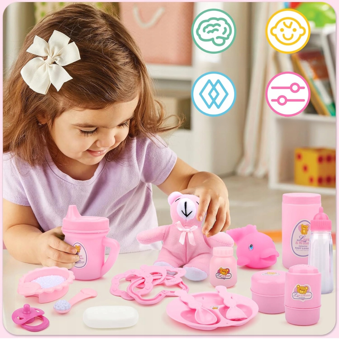 ➡️ Одежда, игрушки для ванной, принадлежности для кормления, соска, мягкие игрушки — все, что нужно малышу, чтобы по-настоящему ухаживать за куклой.