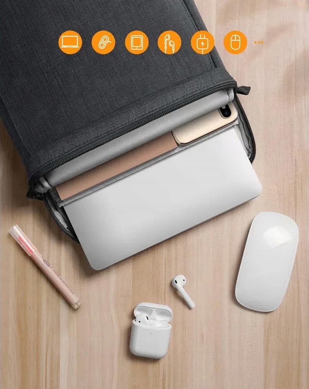 - Внутренняя часть сумки, разделенная на две камеры с мягким плюшевым материалом, чтобы отделить объекты друг от друга и предотвратить поцарапать устройство