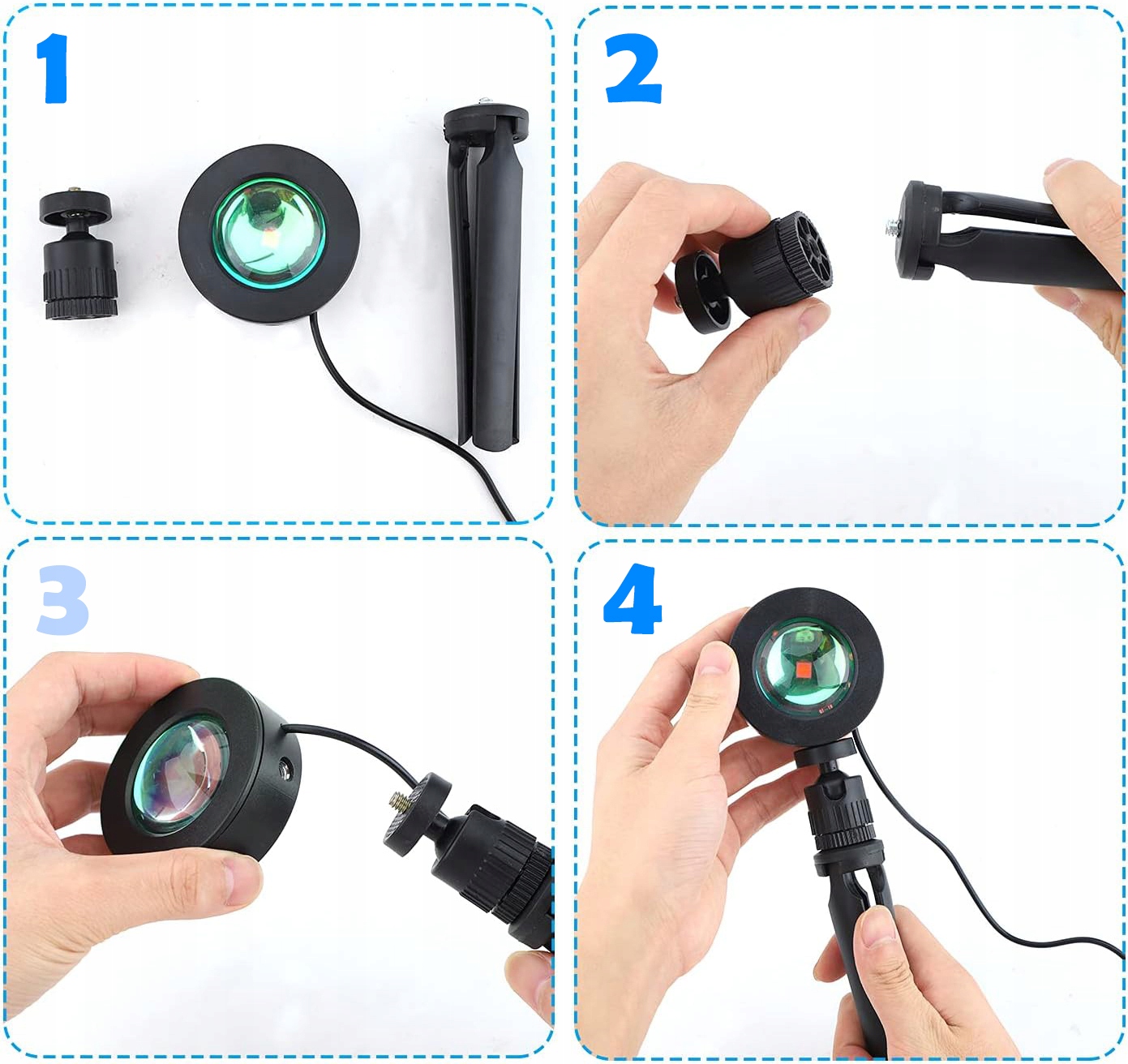 4️⃣ Сборка штатива и подключение лампы: Когда все элементы подключены, разверните штатив и подключите лампу к питанию. поставлять. Готово!