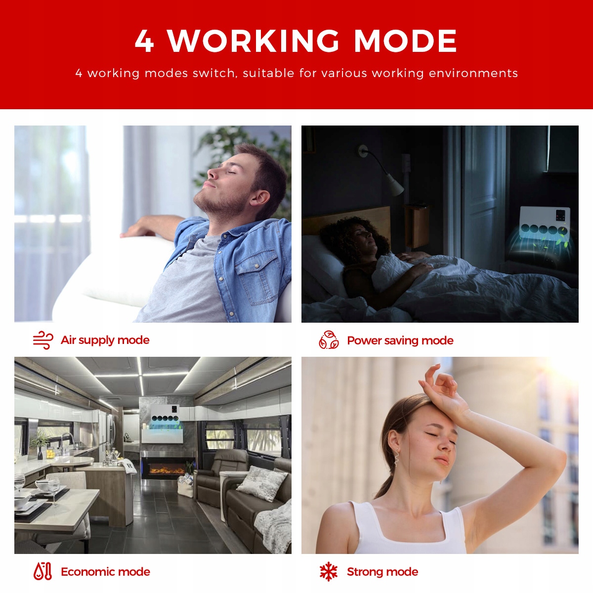 4 режима работы --- режим вентилятора, режим энергосбережения, экономичный режим, сильный режим.