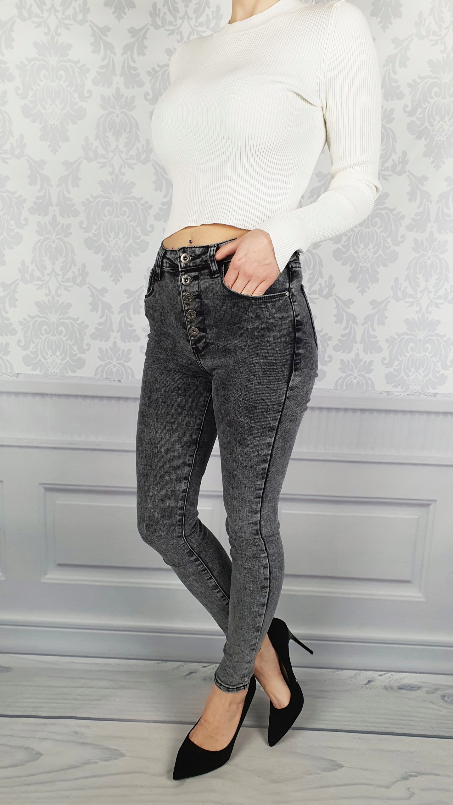 Джинсы на пуговицах, с высокой талией. Отлично подходят для спортивной обуви, но идеально подойдут. Также хорошо сочетаются с обувью на высоком каблуке, поскольку благодаря своей универсальности они подходят практически к любому стилю. Гибкий материал подчеркивает женскую фигуру. Брюки приталенные и тянутся. Подчеркните свои женственные формы! Сделайте свой повседневный образ уникальным. Брюки имеют карманы с обеих сторон.