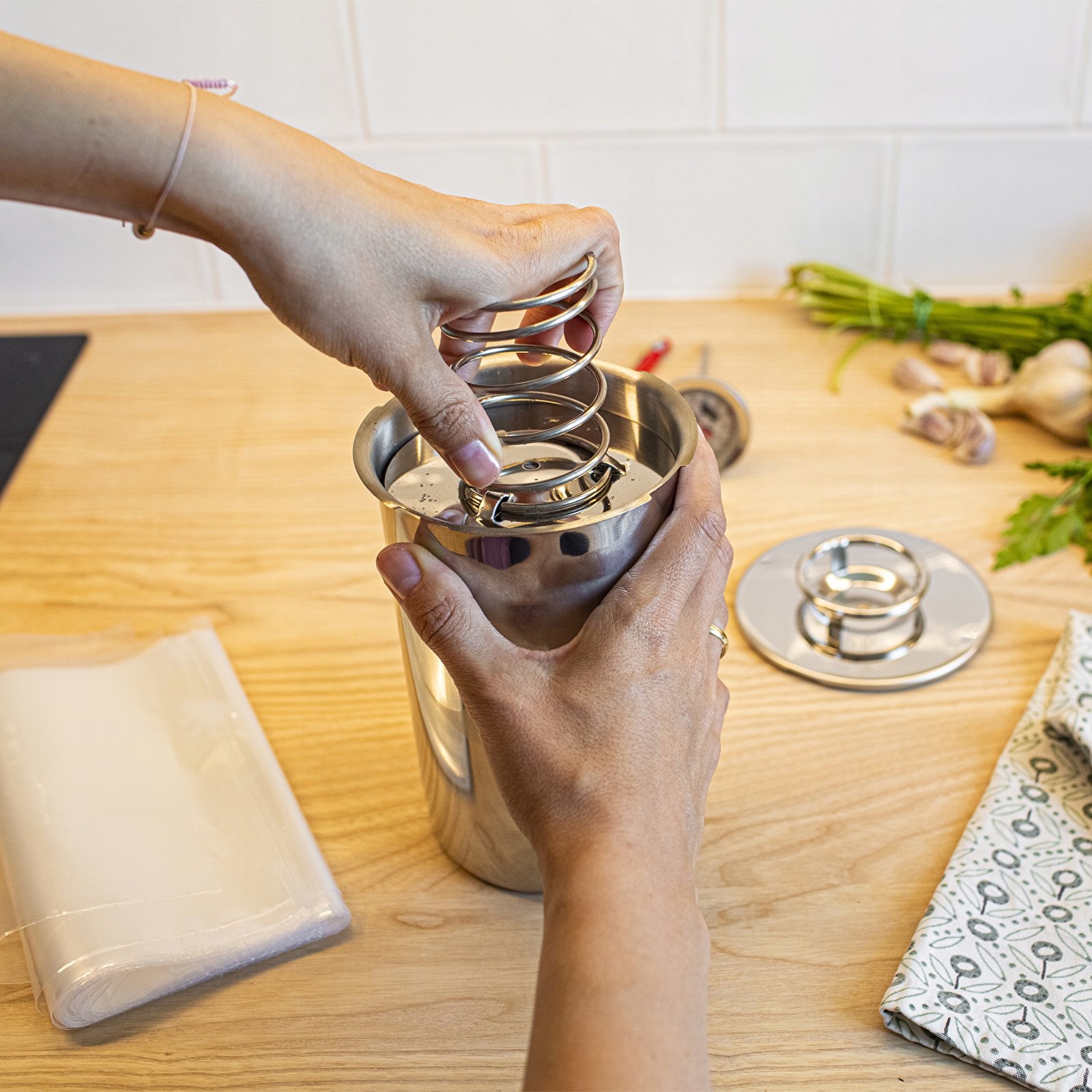 Производитель представляет идеальный для приготовления мяса набор – ветчинницу с термометром и пакетами. Предназначен для приготовления вкусного домашнего мяса на пару. Он прост в использовании и позволяет приготовить до 1,5 кг мясных продуктов.