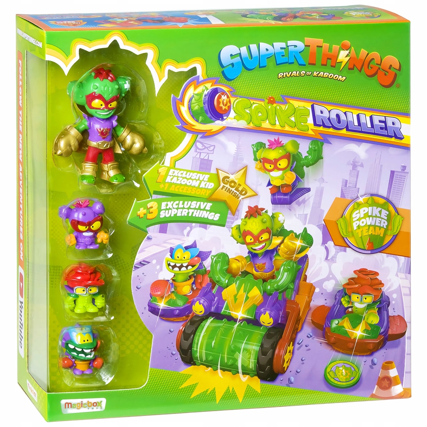 Озорной каток с шипами из серии SuperThings Kazoom Kids, прибыл вместе со своей командой Spike Power, чтобы пошуметь в Кабум-сити! На своем огромном транспортном средстве, украшенном золотыми деталями, он готов уничтожить все, что встанет на его пути... и он не одинок в этой миссии! Его сопровождают три эксклюзивных супервещи и два бластерных самолета, которые могут стрелять дисками и подключаться к основному транспортному средству — максимальная мощь злодея! Секрет в гибкой части, благодаря которой они могут прыгать с земли и неожиданно атаковать Героев. Смогут ли они взять под свой контроль Кабум-Сити? Сила SuperThings теперь в ваших руках!