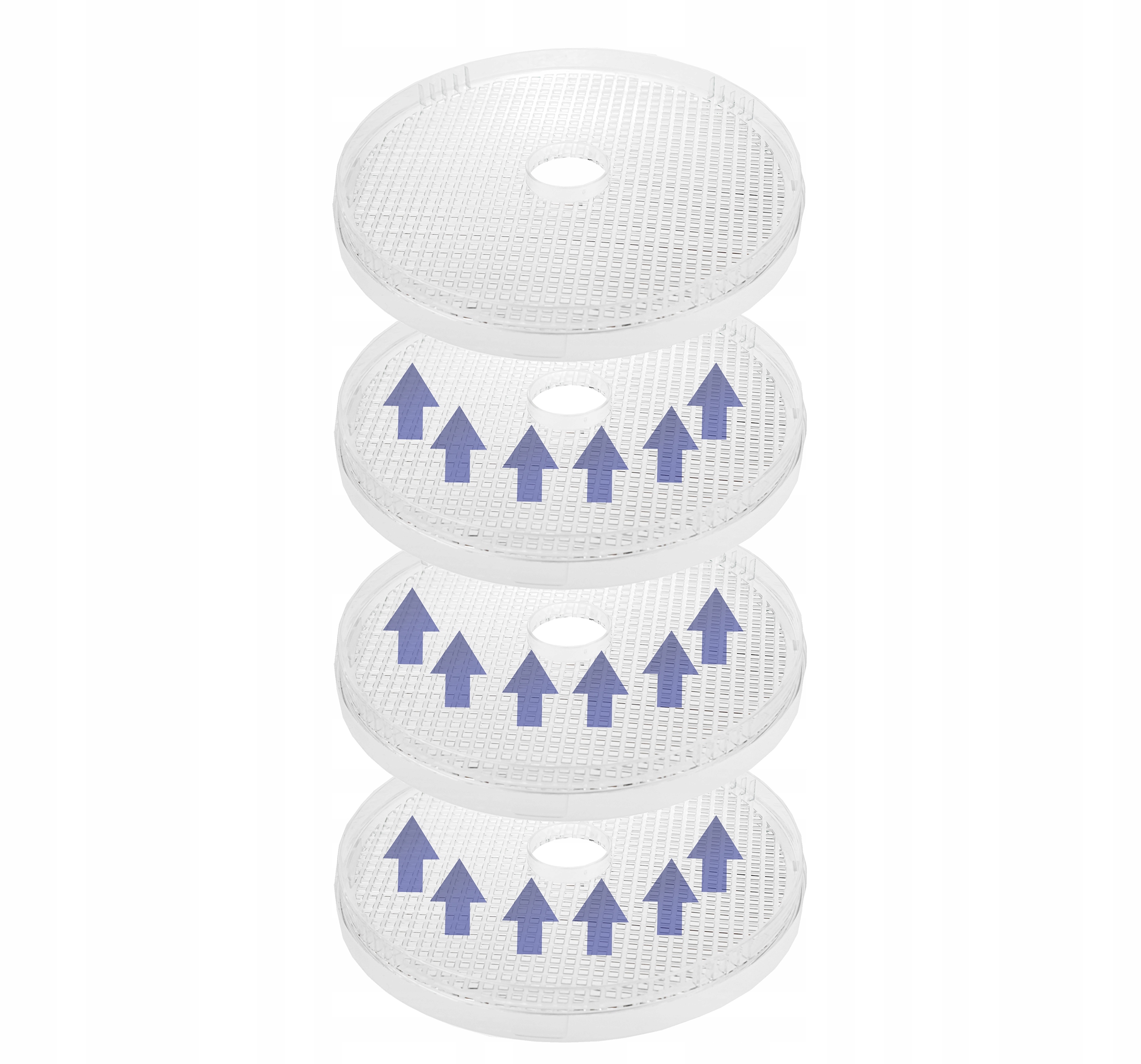 Устройство спроектировано таким образом, чтобы обеспечить наилучшую циркуляцию воздуха, чтобы все фрукты и травы были правильно высушены.