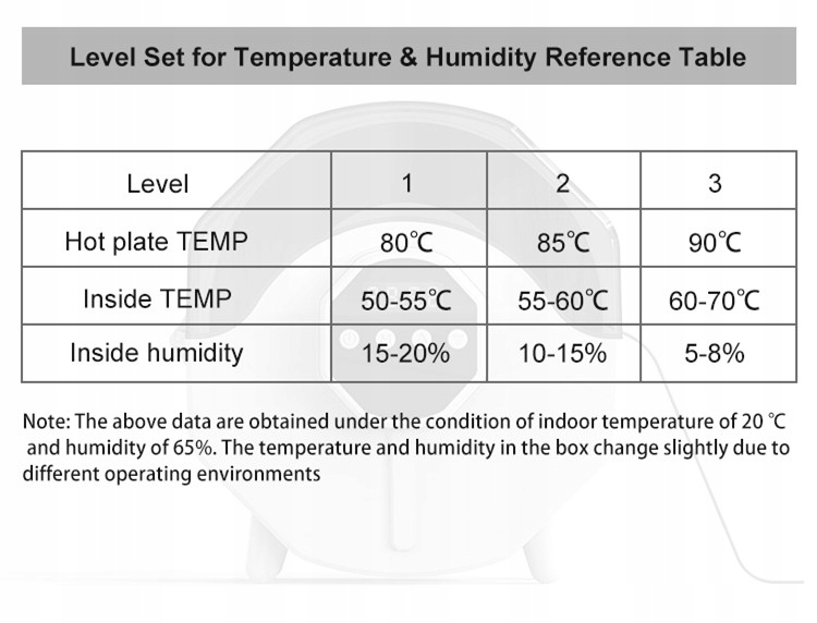 - Уровни температуры: 3 уровня регулировки (Температура внутренней среды: 50–55°C). °C / 55–60 °C / 60–70 °C)