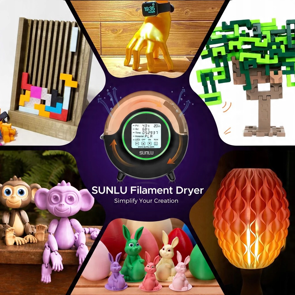 - SUNLU S2 отличается от других тем, что нагревается до 70℃, что делает его идеальным для специальных нитей, таких как ПА/ПК. Нагрев 360 градусов позволяет нагреваться в два раза быстрее, чем у большинства сушилок на рынке