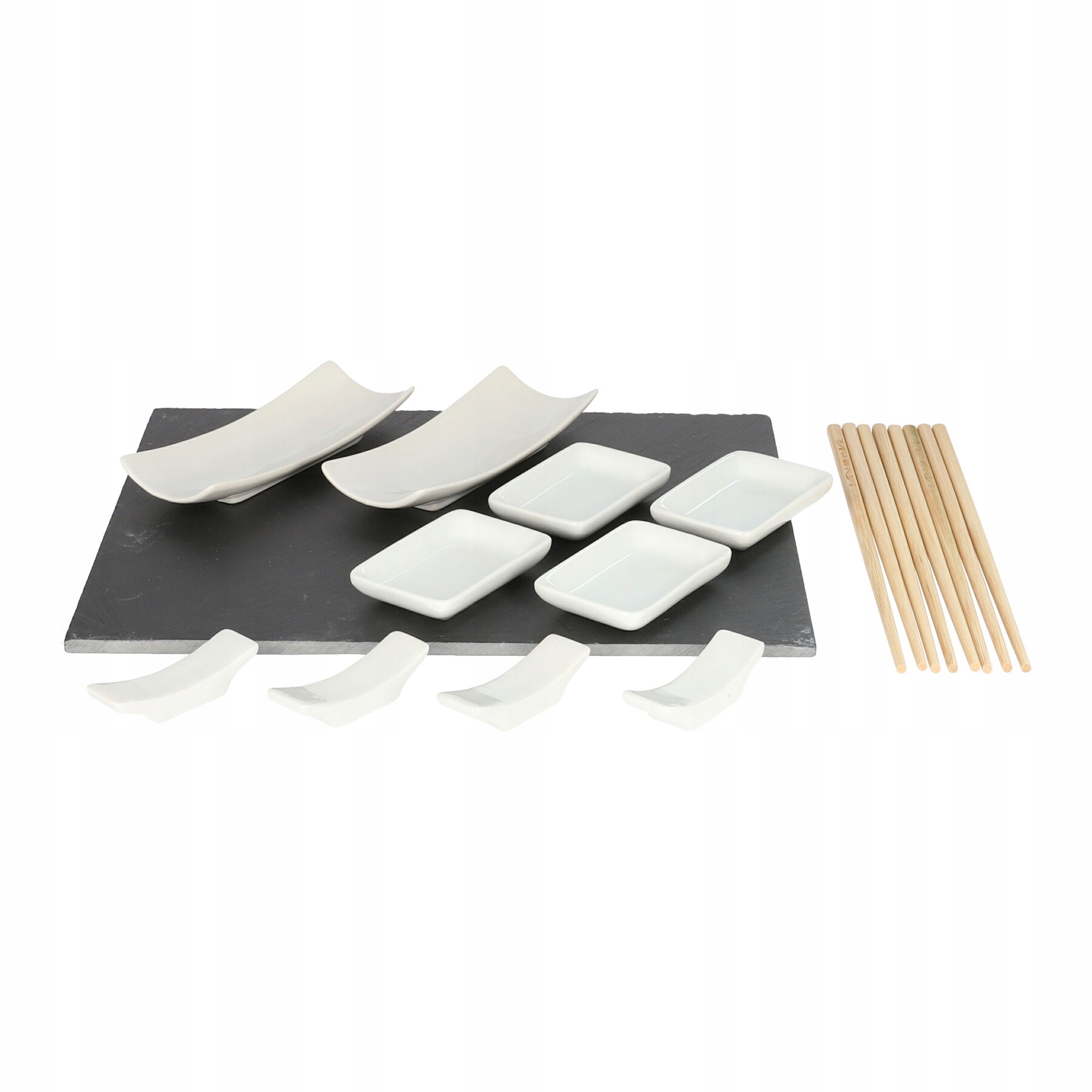 Набор изготовлен из высококачественных материалов, в том числе бамбукового дерева, фарфора и каменного сланца, что обеспечивает не только стильный внешний вид, но и долгий срок службы изделия. Эти материалы прекрасно подходят для подачи как домашних, так и покупных суши.