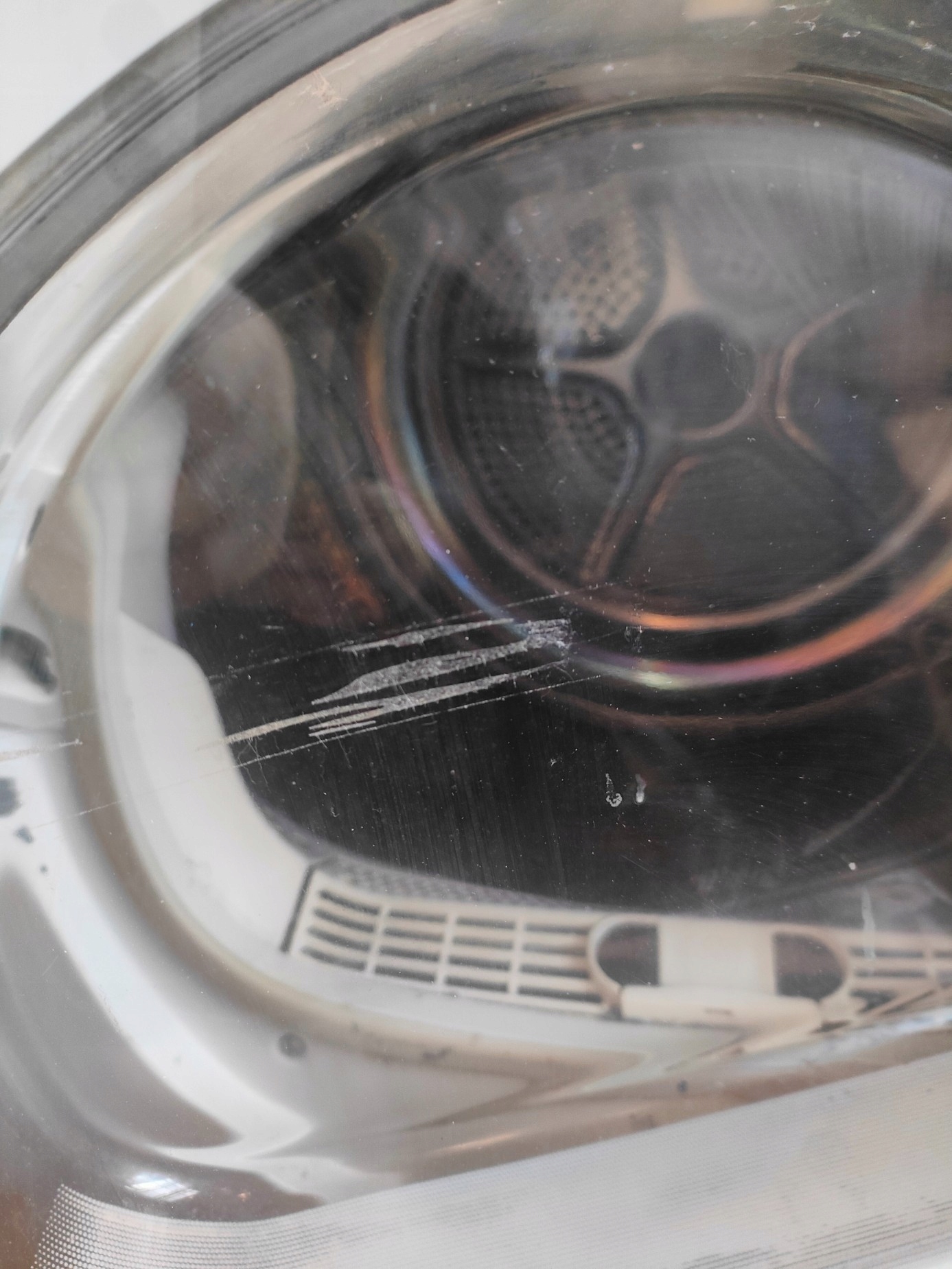Сушилка запускается после подключения к сети (нагрелась внутренняя часть барабана), внутри устройства большое количество остатков ворса, фильтра нет, панель на итальянском языке, инструкция отсутствует, решетка, закрывающая фильтр, сломана одна защелка, контейнер для ворса порван внизу, на нем видны царапины/вмятины/небольшие вмятины в некоторых местах