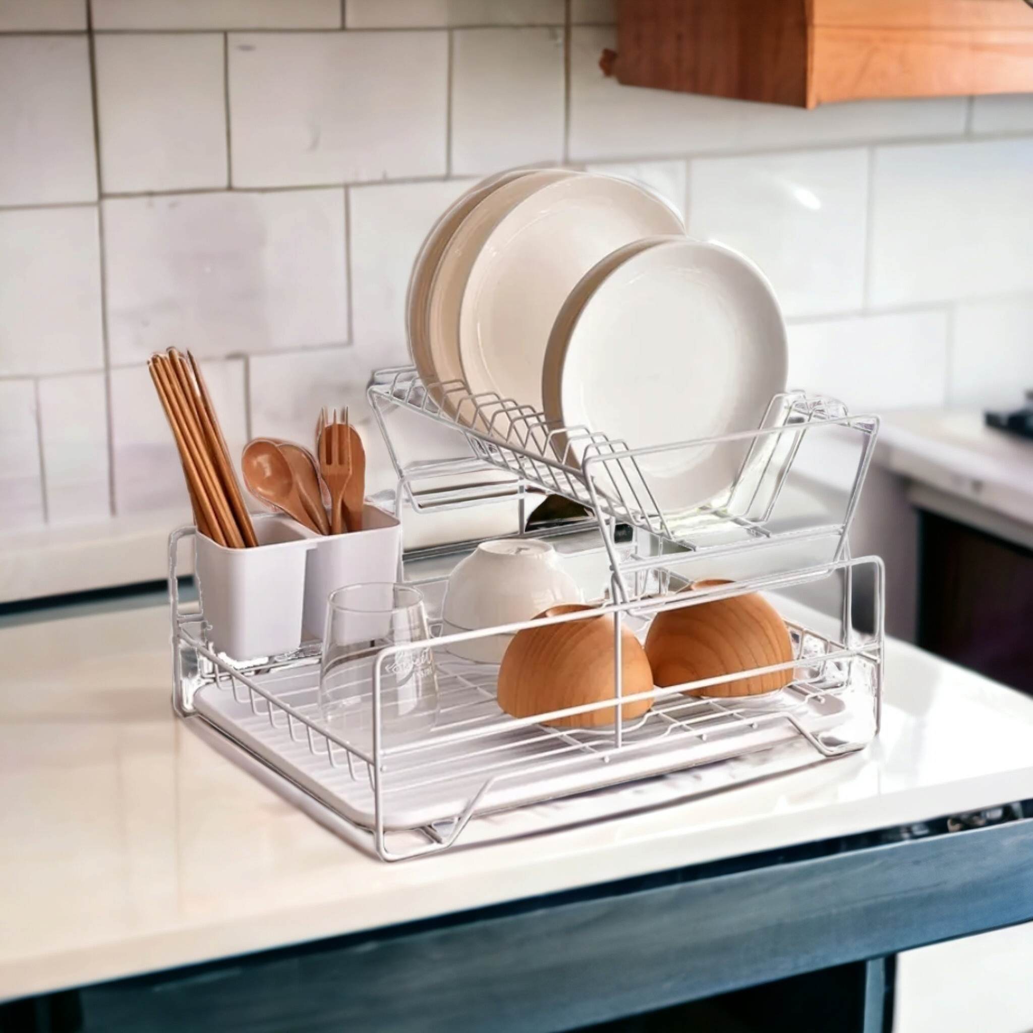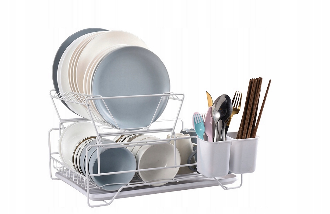 ДВУХУРОВНЕВАЯ СУШИЛКА ДЛЯ БЕЛОЙ ПОСУДЫ С ПОДДОНОМ И КОНТЕЙНЕРАМИ ДЛЯ СТОЛОВЫХ ПРИБОРОВ